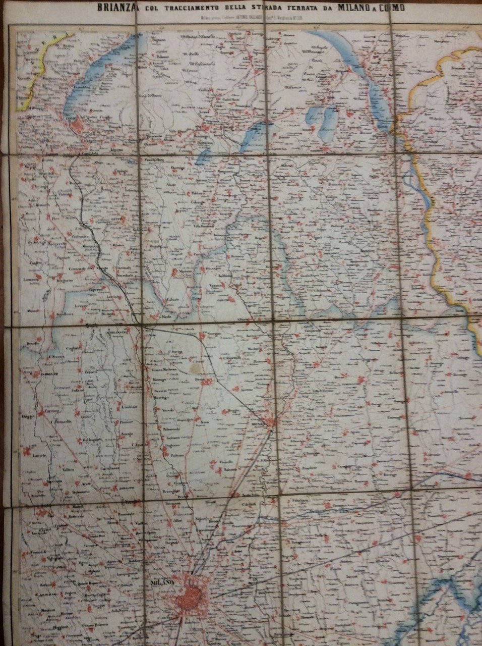 Bella carta topografica a colori della Brianza (cm. 63,5 x 49,3), incisa in rame su disegno di Naymiller, montata su tela e suddivisa in 16 riquadri. Ben conservata.