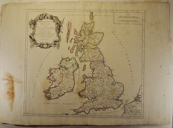 Incisione su rame all'acquaforte e bulino in due fogli incollati di mm 556 x 485. Bella vergata veneziana. Filigrana AV e stelle. Foglio a larghi margini. Una gora pesante sul margine bianco sinistro e tre più lievi entro la battuta. Titolo entro ricco cartiglio in alto a sinistra. Toponimi e descrizioni geografiche nella mappa. Proveniente da: "Atlas universel dressé sur les meilleures cartes modernes", Venezia 1784 (ma 1780). Gli Atlanti stampati da Francesco Santini, che, come indicato spesso nelle carte, teneva bottega a Santa Giustina, nel Sestiere di Castello, riutilizzano le lastre incise da Lattrè e disegnate da Janvier per l' "Atlas Moderne" stampato a Parigi nel 1771. L'Atlante di Janvier ebbe un immediato apprezzamento, sia per la precisione geografica, che per i ricchi cartigli molto decorativi. Robert (Jean) Janvier: working in Paris in the second half of the eighteenth century, Jean Janvier (1746 – 1776) produced a series of maps in the later half of the century. While there is some confusion about his Christian name, his maps usually were inscribed “Le Sieur Janvier”. He is best known for his collaboration with engraver Jean Lattre for an Atlas Moderne first released in 1762 and in several later editions some by C. F. Delamarche and by Chez Remondini. He also produced several maps used in general atlases by William Fadan and P. Santini.