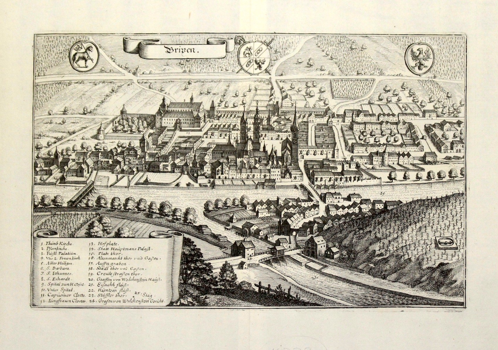 Incisione in rame, 198x308. Bella veduta generale della cittadina. Ottimo esemplare marginoso.