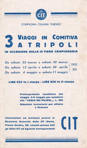 Brochure Compagnia Italiana Turismo - 3 viaggi in comitiva a Tripoli in occasione della IX Fiera Campionaria. 1935
