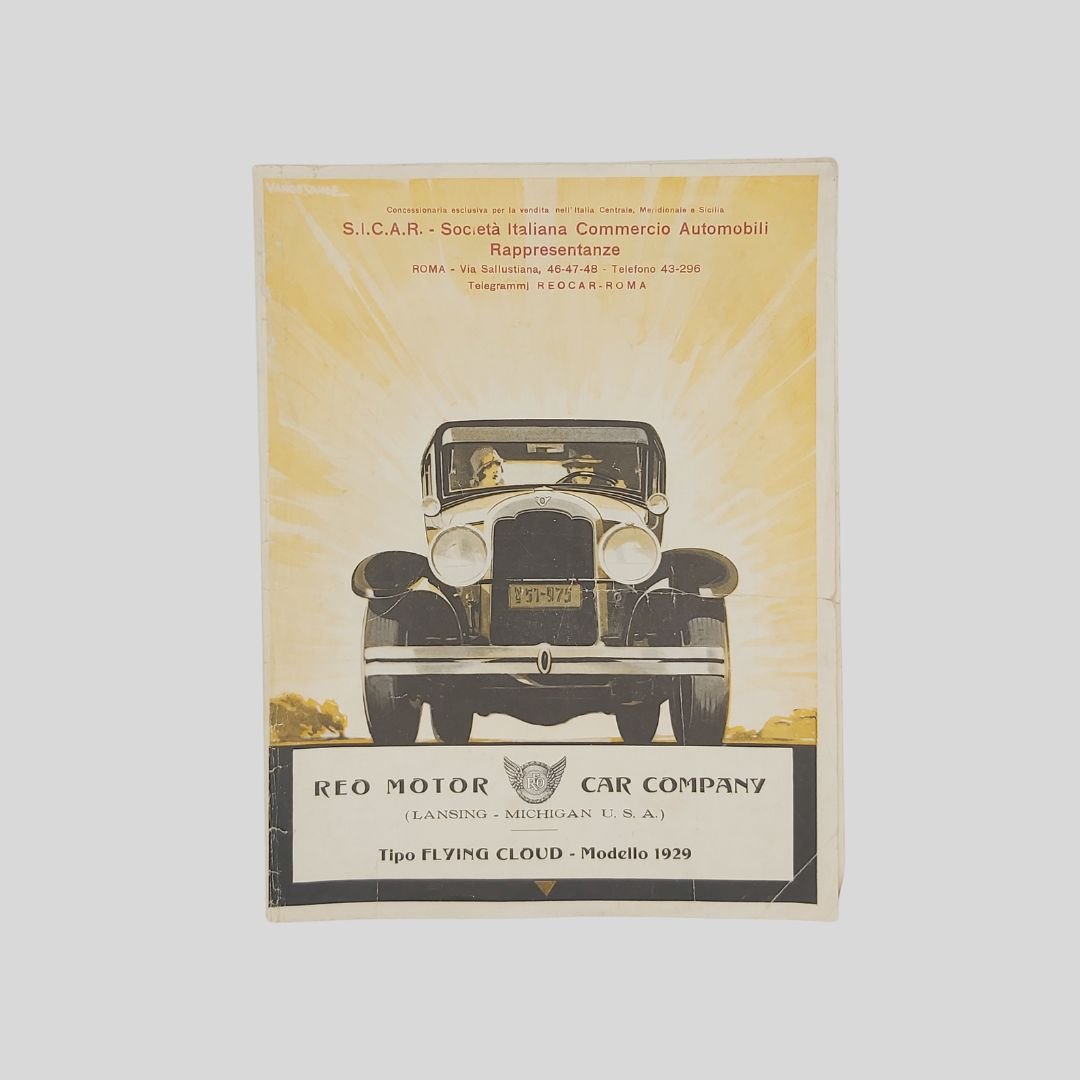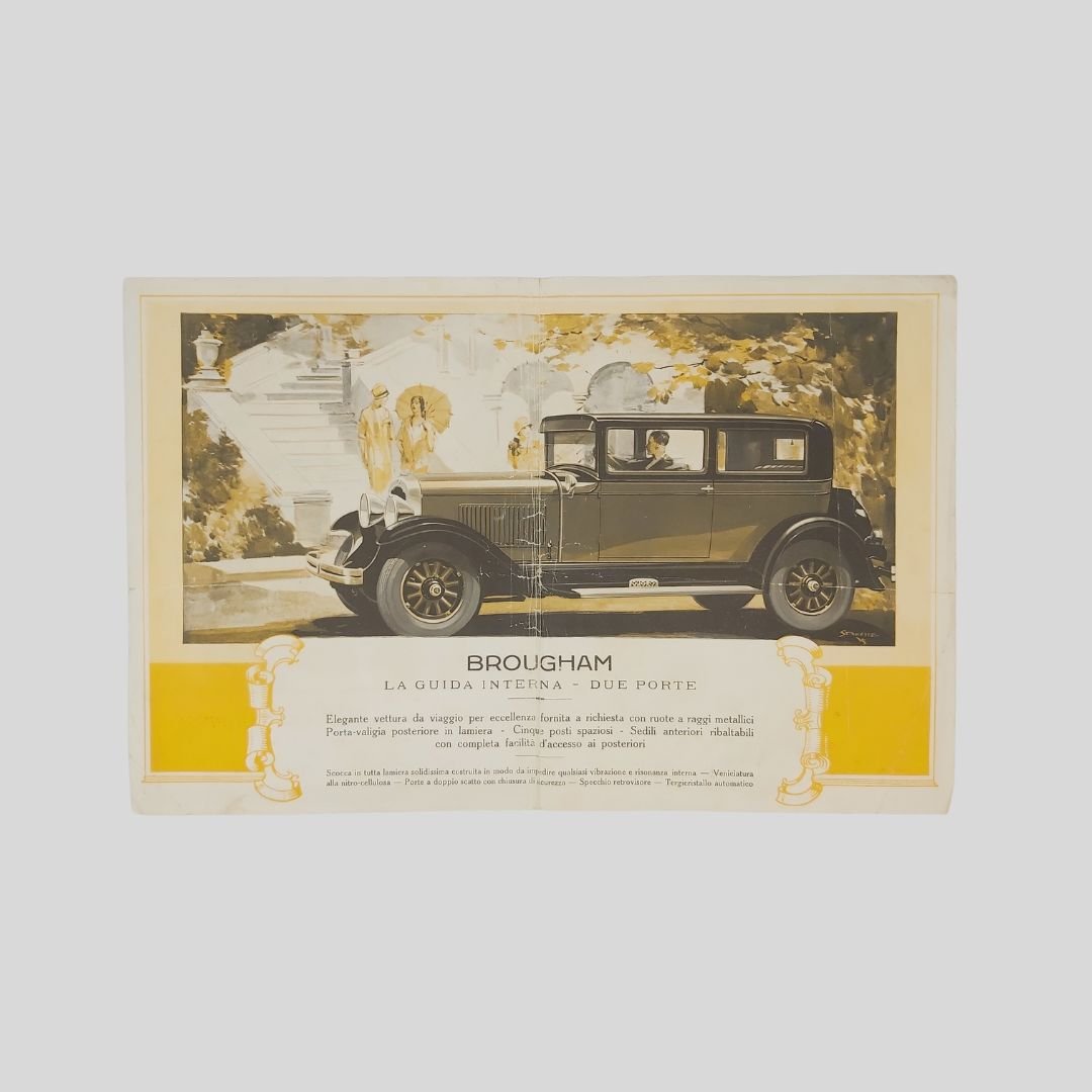 Pieghevole pubblicitario, cm cm 21,5×28 (formato aperto: cm 43×28). Concessionaria per la vendita nell’Italia Centrale, Meridionale e Sicilia S.I.C.A.R. Società Italiana Commercio Automobili Rappresentanze. Sciupato. Evidenti Tracce d’uso. Piegoline. Elegante vettura da viaggio per eccelenza fornita a richiesta con ruote a raggi metallici. Porta-valigia posteriore in lamiera – Cinque posti spaziosi – Sedili anteriori ribaltabili con completa facilità d’accesso ai posteriori.