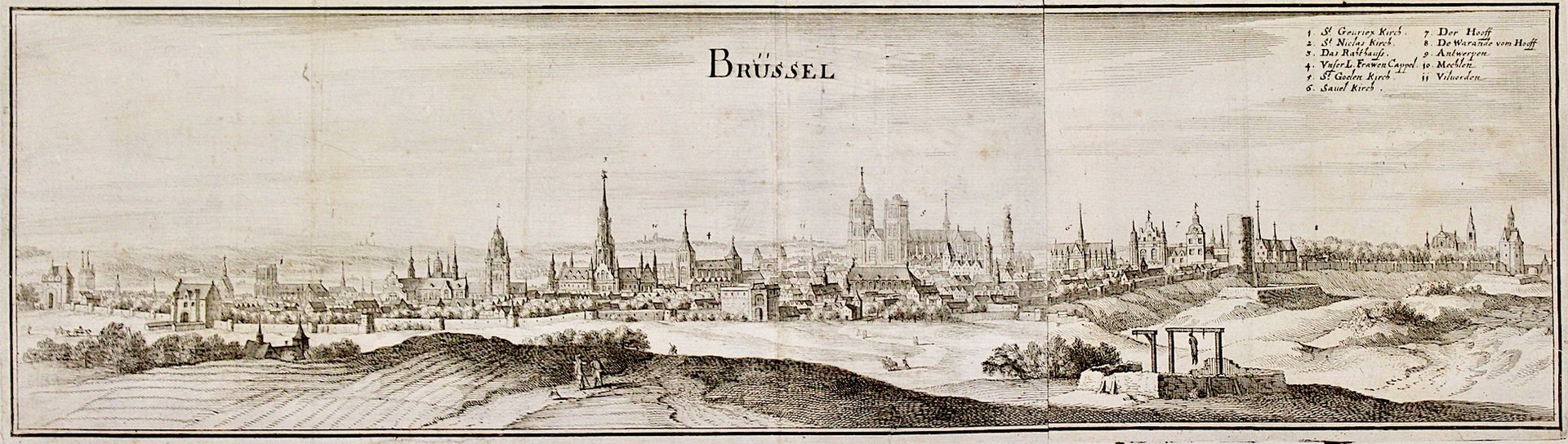 Copper engraving, mm 155x540. From "Neuwe Archontologia cosmica" by Johann Gottfried. Good condition, printing folds, bottom margin with restored tears. Perspective view of the town from the distance. <BR>