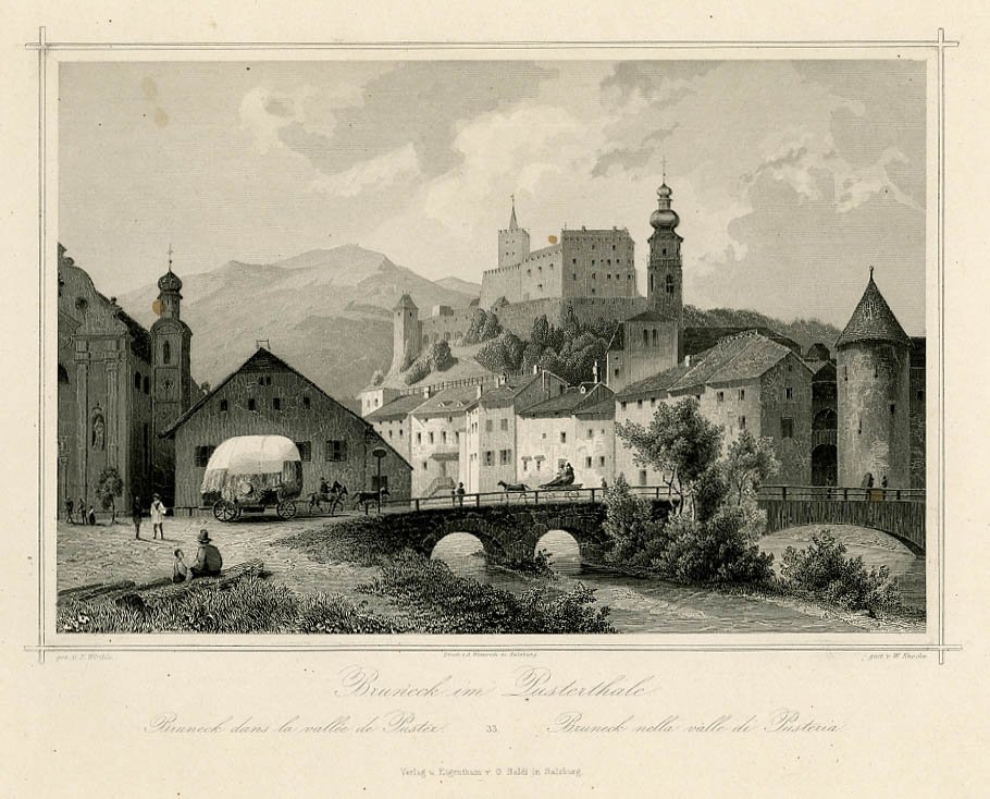 Incisione su acciaio di dimensioni 13x20 cm. Condizioni : USATO - Stato : Buono, ordinari segni d'uso e del tempo. Altre note : Bella veduta di Brunico (Bruneck) in Val Pusteria (Pustertal), dominata dal castello (Burg Bruneck). In primo piano invece il ponte sul fiume Rienza è animato da un traffico di carri e carrozze, mentre la piazza antistante la chiesa sulla sinistra, la cui facciata è tagliata a metà , è affollata di passanti e mendicanti. L'autore della veduta è Friedrich Würthle (1820-1902), allievo di Karl Frommel e attivo a Salisburgo a partire dal 1860.