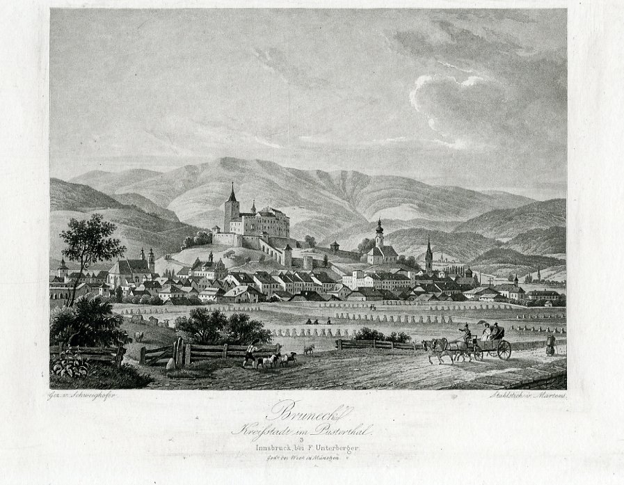 Incisione su acciaio di dimensioni 143x195 mm. Condizioni : USATO - Stato : Buono, ordinari segni d'uso e del tempo. Altre note : Veduta di Brunico (Bruneck) in Val Pusteria (Pustertal). La cittadina con i tetti delle sue numerose chiese (la Neukirche, la chiesa delle Orsoline, la chiesa di S. Caterina) occupa la parte centrale di questa veduta dominata dal castello di Brunico (Burg Bruneck). Nel primo piano invece scene di vita agreste.