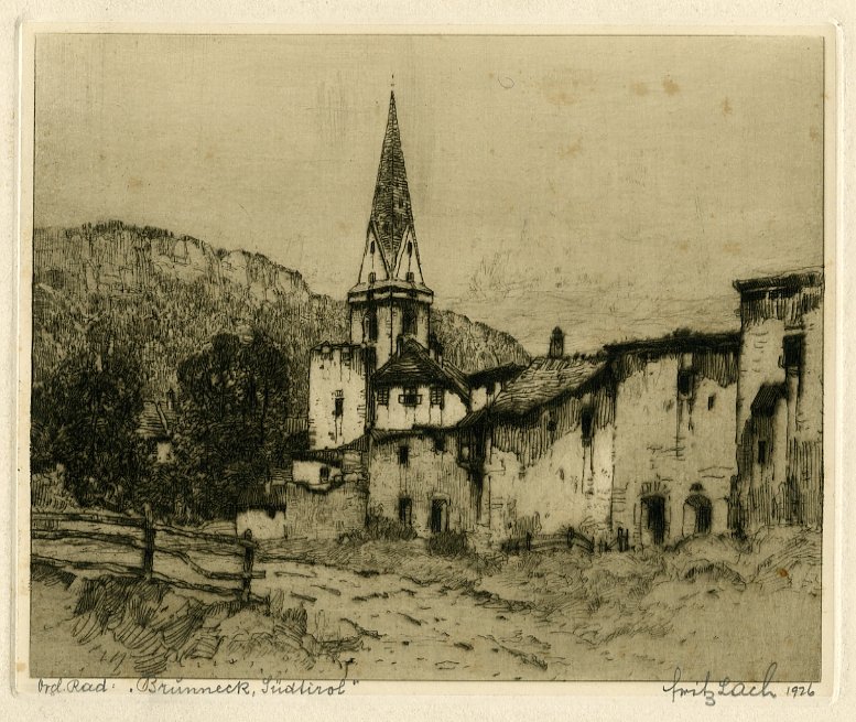 Incisione di dimensioni 152x188 mm. Condizioni : USATO - Stato : Buono, ordinari segni del tempo. Lievissimi segni di foxing. Altre note : Bella veduta di Brunico (Bruneck) ad opera del pittore e grafico austriaco Friedrich (o Fritz) Lach (1868-1933). Noto soprattutto per i suoi acquerelli, studiò a Vienna e a Monaco presso lo zio Josef Hoffmann.