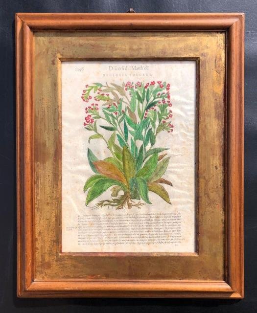 Tratto dal "Petri Andreae Matthioli Medici Senensis Commentarii, in Libros sex Pedacii Dioscoridis Anazarbei, de Materia Medica, Adjectis quàm plurimis plantarum & animalium imaginibus, eodem authore" (opera più comunemente nota come "Materia medica" o come "I Commentari"), pubblicata per la prima volta a Venezia a partire dal 1554 e nota in molte altre edizioni successive. Venezia, Ex Officina Valgrisiana, 1570 circa. Incisione in legno, vecchia coloritura, cm 25 x 35,5 (il foglio), testo in volgare. Al verso incisione in b/n di altro tipo di Narciso con continuazione del testo. Il foglio appartiene al quarto Libro di Dioscoride, come riportato nel titolo. I primi erbari a stampa risalgono all'inizio del Cinquecento, quando la tecnica utilizzata era la xilografia. Pregevole e rinomata, tra le altre, è appunto l'opera di Pietro Andrea Matthioli (Siena, 1501 – Trento, 1578), botanico, medico e umanista. I "Commentari" ebbero grande successo e conobbero numerosissime edizioni perché possono essere considerati come una summa delle conoscenze medico botaniche del tempo, essendo accompagnati da un'accurata descrizione e corredati da ricche illustrazioni in xilografia inserite a fianco del testo o, talvolta, a piena pagina. Esemplare in bella coloritura e in buono stato di conservazione.