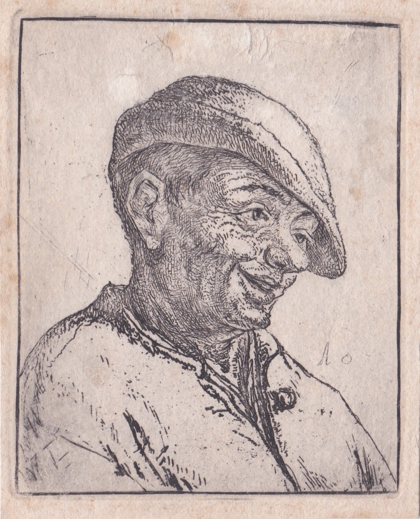 Esempio delle cosiddette "teste di carattere", ritratti caricati, pretesti per studi di espressioni e stati d'animo. Esemplare nel 8/9 stato, con l'aggiunta del monogramma a destra vicino la spalla sinistra e co la linea di contorno vigorosamente ripresa ma prima dell'aggiunta di segni incrociati sulla guancia destra tra orecchione bocca.
