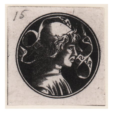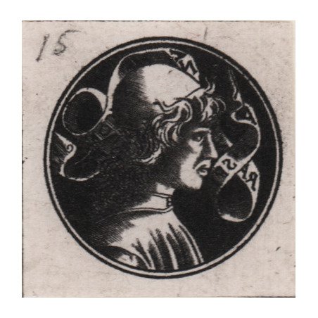 Sul cartiglio, in parte al contrario: LA?SPERANZA?ME?CONFORTA. Copia di un niello della collezione Durazzo, (n. 3009), la cui impressione originale si trova ora nel Gabinetto Rothschild al Louvre. Anche se un tempo attribuita alla scuola veneziana, questa stampa appartiene a un gruppo di ritratti a niello generalmente riconosciuti come prodotti a Bologna, nella cerchia di Francesco Francia, verso la fine del XV secolo. Si tratta presumibilmente del ritratto di una persona reale il cui motto di speranza, iscritto sul cartiglio, è caratteristico del periodo. ' I nielli della collezione Durazzo vennero fatti riprodurre in incisioni dal proprietario, tra fine XVIII e inizio XIX secolo, a Venezia - come specificato anche dal Malaspina nel suo catalogo del 1824 - costituendo una serie che venne diffusa e collezionata dagli amatori. Bartsch descrive queste copie nel suo volume edito nel 1811, data che quindi costituisce il terminusine ante quem per l'esecuzione. On the scroll, partly in reverse: LA?SPERANZA?ME?CONFORTA (Hope comforts me). Copy of a niello print from the Durazzo Collection, (n. 3009), the original impression of which is now in the Cabinet Rothschild at the Louvre. Altough once attributed to the Venetian school, this print belongs to a group of niello portrait prints generally recognized as having been produced in Bologna, in the circle of Francesco Francia, toward the end of the fifteenth century. It is presumably a portrait of an actual person whose hopeful motto, inscribed on the scroll, is characteristic fo the period. The nielli of the Durazzo collection were reproduced in engravings by the owner himself, between the end of the 18th and the beginning of the 19th century, in Venice - as also specified by Malaspina in his catalog of 1824 - constituting a series that was circulated and collected by amateurs. Bartsch describes these copies in his volume published in 1811, a date that therefore constitutes the terminus ante quem for the execution. For the attribution to Maso Finiguerra, disputed by some scholars, see the summary in Zucker in The Illustrated Bartch,1993. Cfr. TIB 2401.015; Duchesne, p. 277, n. 349; Zanetti, pp. 101-02, n. 135
