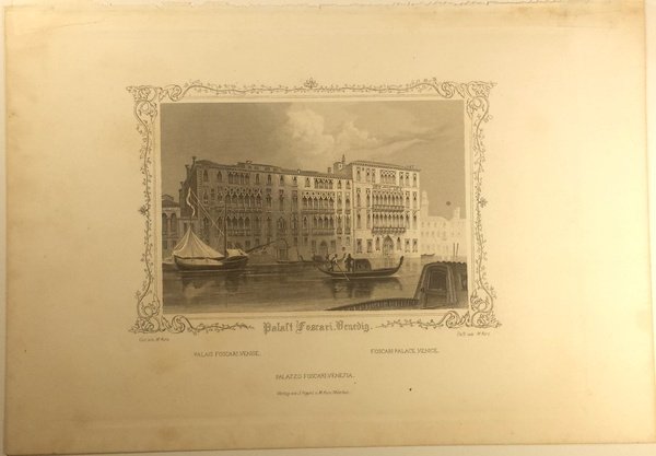 Incisione in acciaio, foglio 23 x 16 cm, 19 x 14 cm alla battuta. Veduta del Canal Grande con la Ca' Foscari. Dentro cornice incisa. In basso al centro"Palast Foscari. Venedig". Ai lati in piccolo: "Gez. von J. Poppel" a sinistra, "Gest. von J. Poppel" a destra.Gez. von J. Poppel. Gest. von J. Poppel.". Più in basso il titolo ripetuto in francese, inglese e italiano. Ancora più in basso in centro: "Verlag von J Poppel u. M. Kurz Munchen". Proveniente da: "Venedig: 24 Ansichten nach der Natur gezeichnet, gestochen und herausgegeben von J. Poppel und M. Kurz; mit geschichtlichem und beschreibendem Text von Rudolph Loser."Johann Gabriel Friedrich Poppel (1807-1882): editore, pittore, incisore calcografico e incisore d'acciaio tedesco.