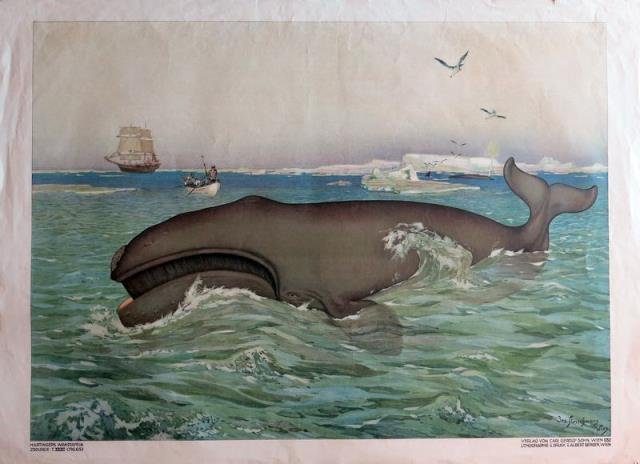 Vienna, 1905. Litografia stampata a colori, cm 70 x 96 (al foglio). Sulla sinistra al margine inferiore bianco: Hartingers Vandtafeln, Zoologie, Tav. XXXII (Fig. 65); sulla destra al margine inferiore bianco: Verlag von Carl Gerold's Sohn, Wien, MV - Litographie U. Druck, V. Albert Berger, Wien. Bellissima scena con questa grande balena in primo piano, gli arpionatori sulla barca che si avvicina all'animale, un veliero, uccelli e ghiacciai sullo sfondo. Alcune lievi e normali gualciture al margine superiore ma esemplare in buono stato di conservazione. .