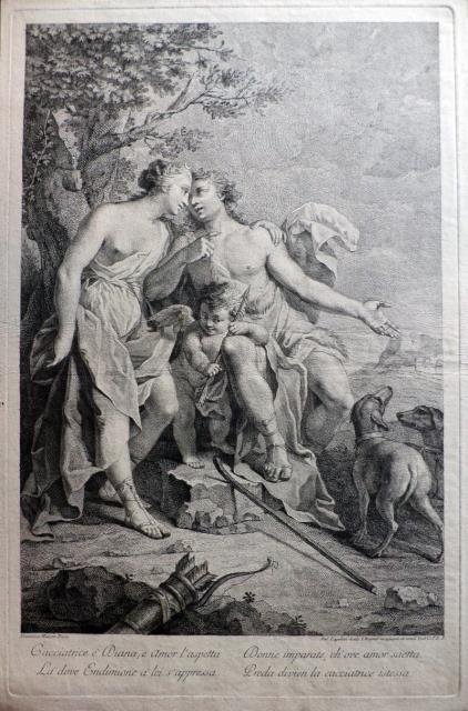 Venezia, 1760 circa. Incisione in rame all'acquaforte, b/n, cm 33,7 x 52 (alla lastra) più margini. In basso a sinistra, in lastra, ma fuori dall'inciso, “Domenico Maiotto Pinx.”; in basso a destra, in lastra, fuori dall'inciso “Ant. Capellan Sculp. I. Wagner recognovit et vend. Ven. C. P. E. S.”; in lastra, nell'inciso, ai piedi della cacciatrice e in prossimità delle frecce, il monogramma F. I. T. D. Antonio Capellan (Veneto, 1740 circa - dopo il 1783), incisore veneziano di cui si hanno scarsissime notizie. Si forma sotto la guida del maestro tedesco Wagner e lavora alle sue dipendenze per alcuni anni, incidendo da solo o in collaborazione col Berardi, il Maggiotto e il Piazzetta. Di questa sua attività veneziana conosciamo alcune incisioni da lui firmate, ma recanti anche il nome del Wagner come quello del supervisore artistico (“Wagner recognovit”, come nel caso della nostra) o, più semplicemente, dell'editore (“appo Wagner”); Domenico Fedeli detto il Maggiotto (Venezia, 1713 – Venezia, 1794); Giuseppe Wagner (Germania, Thalendorf, 1706 – Venezia, 1780). Bella scena a largo tratteggio del chiaroscuro, in ampi margini e in ottimo stato di conservazione.