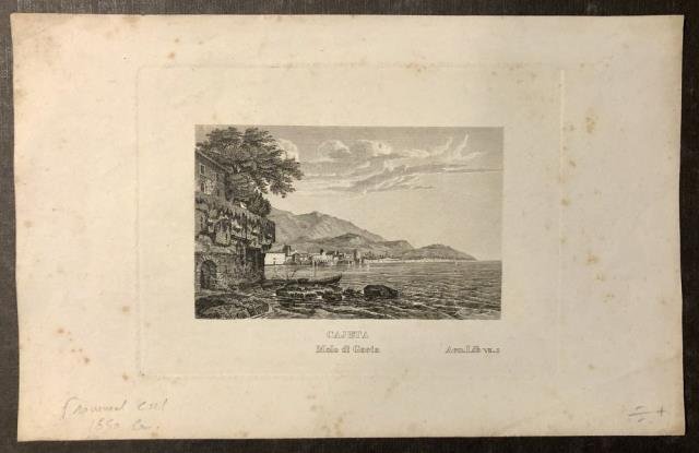 1840 circa. Incisione in rame, b/n, cm 10 x 15 (alla lastra) più margini. Veduta tratta dall' "Eneide di Virgilio", illustrata da Carl Frommel, dal titolo "50 Bilder zu Virgils Heneide, interessante guida che racconta il viaggio dell'Eneide toccando parte del Lazio, della Sicilia e della Grecia. Gestochen unter der Leitung von C. Frommel". Carl Frommel fu pittore e incisore di Scuola tedesca. Dopo aver visitato l'Italia, si fermò in Germania e diventò professore di pittura e di incisione a Carlsruhe. In seguito si recò in Inghilterra dove aprì un atelier di incisione. Qualche leggera fioritura, buono stato.