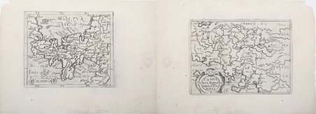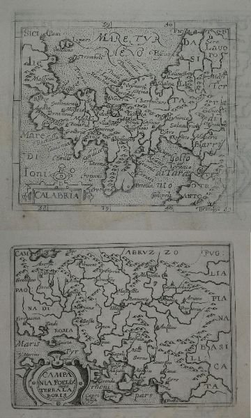 Rarissima carta geografica, due carte stampate al verso e al recto del foglio, tratte dal "Delitiae Italiae et index viatorius, indicans itinera ab urbe Roma ad omnes in Italia". Cyprian Eichovius è lo pseudonimo di Matthias Quad (Deventer 1557 - Colonia 1613). Come spesso succedeva all'epoca per sfuggire alle persecuzioni cattoliche contro i protestanti Matthias Quad usò per la sua attività diversi pseudoni¬mi, tra cui quelli noti di C. Eichovius, M. Quadus, M. Quad von Kinckelbach e quello di Konrad Loew. Fuggito dall'Olanda in Germania nel 1587, studiò ad Heidelberg e divenne poi uno dei più prolifici esponenti della cosiddetta Scuola Cartografica di Colonia, durata per circa mezzo secolo (1570-1620 ca.) e formata principalmente da rifugiati fiamminghi ed olandesi tra i quali spiccano lo stesso Quad e Frans Hogenberg che ne fu il fondatore. Nel 1594 Quad pub¬blica a Colonia Europae, totius terrarum orbis partis praestantissimae descriptio. Nel 1596 ca., sempre a Colonia pubblica Typus Orbis Terrarum, ad Imitationem Universalis Gerhardi Mercatoris, un planisfero sulla base dell'opera marcatoria-na e nel 1600 pubblica il suo primo atlante mondiale autonomo: Geographisch Handtbuch, che è anche il primo edito in lingua tedesca. Nel 1608 ne uscì una edizione in latino Fasciculus Geographicus con quattro mappe inedite incise da Johann Bussemacher, suo assiduo collaboratore. A causa dei suoi numerosi pseudonimi la sua vasta produzione editoriale rimane ancora da identificare completamente. Le carte del Quad ebbero poca fortuna poiché stampate nel periodo dei grandi successi degli atlanti Orteliani; pertanto nessuna ristampa dell’atlante è nota, rendendolo rarissimo e molto ricercato nel mercato antiquario. Rarissima carta geografica, due carte stampate al verso e al recto del foglio, tratte dal "Delitiae Italiae et index viatorius, indicans itinera ab urbe Roma ad omnes in Italia". Cyprian Eichovius è lo pseudonimo di Matthias Quad (Deventer 1557 - Colonia 1613). Come spesso succedeva all'epoca per sfuggire alle persecuzioni cattoliche contro i protestanti Matthias Quad usò per la sua attività diversi pseudoni¬mi, tra cui quelli noti di C. Eichovius, M. Quadus, M. Quad von Kinckelbach e quello di Konrad Loew. Fuggito dall'Olanda in Germania nel 1587, studiò ad Heidelberg e divenne poi uno dei più prolifici esponenti della cosiddetta Scuola Cartografica di Colonia, durata per circa mezzo secolo (1570-1620 ca.) e formata principalmente da rifugiati fiamminghi ed olandesi tra i quali spiccano lo stesso Quad e Frans Hogenberg che ne fu il fondatore. Nel 1594 Quad pub¬blica a Colonia Europae, totius terrarum orbis partis praestantissimae descriptio. Nel 1596 ca., sempre a Colonia pubblica Typus Orbis Terrarum, ad Imitationem Universalis Gerhardi Mercatoris, un planisfero sulla base dell'opera marcatoria-na e nel 1600 pubblica il suo primo atlante mondiale autonomo: Geographisch Handtbuch, che è anche il primo edito in lingua tedesca. Nel 1608 ne uscì una edizione in latino Fasciculus Geographicus con quattro mappe inedite incise da Johann Bussemacher, suo assiduo collaboratore. A causa dei suoi numerosi pseudonimi la sua vasta produzione editoriale rimane ancora da identificare completamente. Le carte del Quad ebbero poca fortuna poiché stampate nel periodo dei grandi successi degli atlanti Orteliani; pertanto nessuna ristampa dell’atlante è nota, rendendolo rarissimo e molto ricercato nel mercato antiquario. Cfr.