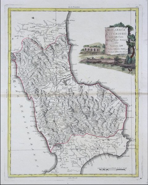 Carta geografica tratta dall’Atlante novissimo, illustrato ed accresciuto sulle osservazioni e scoperte fatte dai più celebri e più recenti geografi. Stampato in quattro volumi da Antonio Zatta tra il 1779 ed il 1785. Atlante fra i più belli e completi mai pubblicati in Italia nel XVIII secolo, l'opera più famosa dello Zatta. L’Atlante Novissimo, come si specifica anche nel titolo, è “accresciuto sulle osservazioni scoperte fatte dai più celebri e più recenti geografi”. Tra le novità più significative vi è la comparsa delle nuove isole scoperte nell'Oceano Pacifico da James Cook e la prima carta italiana della Nuova Zelanda. Le illustrazioni furono ' ideate e disegnate dai suoi collaboratori Giovanni Marco Pitteri, Anton Friedrich Busching, Pietro Antonio Novelli ed incise da Giuliano Zuliani. Il primo tomo dell’atlante è introdotto da un breve saggio di geografia generale dove l’autore definisce in modo sintetico e preciso gli elementi che compongono i reticoli eclittico ed equatoriale usati nelle tavole. Interessante la sezione dove si sofferma ' a descrivere il fenomeno della precessione degli equinozi e quello della variazione ciclica dell'obliquità dell'eclittica. Acquaforte, stampata su carta vergata coeva, coloritura coeva dei contorni, in buone condizioni. Map from the Atlante novissimo, illustrato ed accresciuto sulle osservazioni e scoperte fatte dai più celebri e più recenti geografi. Printed in four volumes by Antonio Zatta between 1779 and 1785. ' Atlas among the most beautiful and complete ever published in Italy in the eighteenth century, the most famous work of Zatta. The Atlante Novissimo, as also specified in the title, is “increased on the observations made by the most famous and most recent geographers”. Among the most significant innovations there is the appearance of the new islands discovered in the Pacific Ocean by James Cook and the first Italian map of New Zealand. The illustrations were designed and drawn by his collaborators Giovanni Marco Pitteri, Anton Friedrich Busching, Pietro Antonio Novelli and engraved by Giuliano Zuliani. The first volume of the atlas is introduced by a brief essay of general geography where the author defines in a concise and precise way the elements that make up the ecliptic and equatorial grids used in the tables. Interesting is the section where he pauses to describe the phenomenon of precession of the equinoxes and the cyclical variation of the obliquity of the ecliptic. Etching, printed on contemporary laid paper, contemporary outline coloring, in good condition. Cfr. I. Principe "Carte geografiche di Calabria nella raccolta Zerbi", pp. 158-159