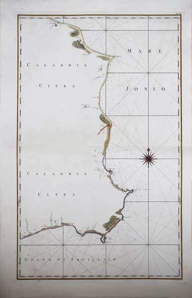Carta nautica tratta del celebre ' Atlante Marittimo delle Due Sicilie ' opera realizzata dal cartografo padovano tra il 1783 ed il 1792. Incisa da Giuseppe Guerra. Rizzi Zannoni è considerato come il più importante cartografo italiano dai tempi di Giovanni Antonio Magini. Attivo in Francia, a Padova e soprattutto a Napoli (1781/1814), dove, nel periodo borbonico, poté fregiarsi anche del titolo di "geografo del Re". Con la venuta dei francesi, Rizzi Zannoni continuò ad attendere alla realizzazione delle carte del Regno. Nel 1807, fu posto a capo del Deposito topografico, istituito da Giuseppe Bonaparte; nel 1812, sotto il regno di Gioacchino Murat, riuscì a stampare l'ultimo dei 31 fogli dell'atlante geografico, la cui pubblicazione era iniziata nel 1788. ' Le opere realizzate a Napoli, in oltre trenta anni di attività, lo consacrarono come il maggiore cartografo italiano dell'età moderna ed uno dei più accreditati in Europa. Incisione in rame, lieve gora d'acqua, per il resto in ottimo stato di conservazione. Bibliografia V. Valerio, ' I Rami dell'Atlante Marittimo. Matrici, disegni, documenti del primo rilievo idrografico del Regno di Napoli. Nautical chart taken from the famous ' Atlante Marittimo delle Due Sicilie ' (Maritime Atlas of the Two Sicilies) by Rizzi Zannoni, printed between 1783 and 1792. Engraved by Giuseppe Guerra. ' Rizzi Zannoni is considered as the most important Italian cartographer since Giovanni Antonio Magini. Active in France, Padua and especially in Naples (1781/1814), where, in the Bourbon period, he could also boast the title of "geographer of the King". With the coming of the French, Rizzi Zannoni continued to attend to the realization of the charts of the Kingdom. In 1807, he was placed in charge of the Topographical Depot, established by Joseph Bonaparte; in 1812, under the reign of Joachim Murat, he managed to print the last of the 31 sheets of the geographical atlas, whose publication had begun in 1788. The works made in Naples, in over thirty years of activity, consecrated him as the greatest Italian cartographer of the modern age and one of the most accredited in Europe. Copper engraving, slight water marks, otherwise in excellent condition. Bibliografia V. Valerio, ' I Rami dell'Atlante Marittimo. Matrici, disegni, documenti del primo rilievo idrografico del Regno di Napoli. Cfr. Valerio, I Rami dell'Atlante Marittimo. Matrici, disegni, documenti del primo rilievo idrografico del Regno di Napoli.
