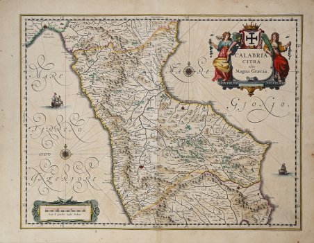 Elegante carta eseguita sul modello di Magini. Willem Janszoon Blaeu, avviò nel 1599 la sua attività di costruttore di globi e strumenti astronomici ad Amsterdam. Nel 1630, dopo aver comprato alcune lastre dell’atlante del Mercator da Jodocus Hondius II, fu in grado di pubblicare un volume di 60 mappe con il titolo di ' Atlantis Appendix. Cinque anni dopo, pubblicò i primi due volumi del suo atlante ' Atlas Novus ' o ' Theatrum Orbis Terrarum, ' in sei libri. Dopo la sua morte, Joan (Johannes) continuò l’opera paterna, completando l’intera serie di sei volume dell’Atlas Novus ' intorno al 1655. Fu inoltre autore di un ' Atlas Maior sive Cosmographia Blaviana, in 12 volumi pubblicati nel 1662 -72, dei quali uno dedicato all'Italia. La carta compare per la prima volta nel terzo volume del ' Theatrum. ' Secondo Koeman viene pubblicata in primis nell'edizione francese del 1640, dal titolo ' Le Theatre du Monde ou Nouvel Atlas, ' Mis en lumiere par Guillaume & Jean Blaeu. ' Troisieme partie. A Amsterdam, Chez Iean & Corneille Blaeu MDCXL. Il terzo volume del ' Theatrum ' contiene 58 carte dell'Italia e 4 della Grecia (cfr. Koeman, ' Atlas Neerlandici, pp. 160-162, Bl 35A). Le carte dell'italia derivano tutte dall'opera di Giovanni Antonio Magini. Tuttavia, sembra più probabile che il Blaeu si basi sue quelle di Hendrick Hondius e Johannes Janssonius pubblicate nel ' Theatrum Italiae in quo Eius Regna, Domina, Ducatus, Et Speciatim Illorum Provinciae, Tabulis Accuratissimis, Iam, De Novo in Lucem Editio, Describunter, Quorum Sequens Pagina Indicabit, stampato ad Amsterdam da Hendrick Hondius nel 1636. ' Sebbene pubblicate dopo la morte di Willem Janszoon Blaeu (1638) le carte spesso recano il suo imprint. Non è dato sapere se fossero tutte già pronte o se i figli Johannes e Cornelis le compilarono postume. Incisione in rame, bella coloritura coeva, in ottimo stato di conservazione. Striking wide margined example of Blaeu's decorative map of ' northern Calabria. Willem Janszoon Blaeu, started in 1599 his business as a builder of globes and astronomical instruments in Amsterdam. In 1630, after buying some plates of the Mercator atlas from Jodocus Hondius II, he was able to publish a volume of 60 maps under the title ' Atlantis Appendix. Five years later, he published the first two volumes of his atlas ' Atlas Novus ' or ' Theatrum Orbis Terrarum, in six books. After his death, Joan (Johannes) continued his father's work, completing the entire six-volume ' Atlas Novus ' series around 1655. He was also the author of an ' Atlas Maior sive Cosmographia Blaviana, in 12 volumes published in 1662 -72, one of which was devoted to Italy. The map first appears in the third volume of the Theatrum. According to Koeman it is first published in the French edition of 1640, entitled Le Theatre du Monde ou Nouvel Atlas, Mis en lumiere par Guillaume & Jean Blaeu. Troisieme partie. In Amsterdam, Chez Iean & Corneille Blaeu MDCXL. The third volume of the Theatrum contains 58 maps of Italy and 4 of Greece (see Koeman, Atlas Neerlandici, pp. 160-162, Bl 35A). The maps of Italy are all derived from the work of Giovanni Antonio Magini. However, it seems more likely that Blaeu relies on those of Hendrick Hondius and Johannes Janssonius published in Theatrum Italiae in quo Eius Regna, Domina, Ducatus, Et Speciatim Illorum Provinciae, Tabulis Accuratissimis, Iam, De Novo in Lucem Editio, Describunter, Quorum Sequens Pagina Indicabit, printed in Amsterdam by Hendrick Hondius in 1636. Although published after the death of Willem Janszoon Blaeu (1638) the maps often bear his imprint. It is not known whether they were all ready-made or if his sons Johannes and Cornelis completed them posthumously. Copperplate, fine origianl colouring, in very good conditions. Cfr.