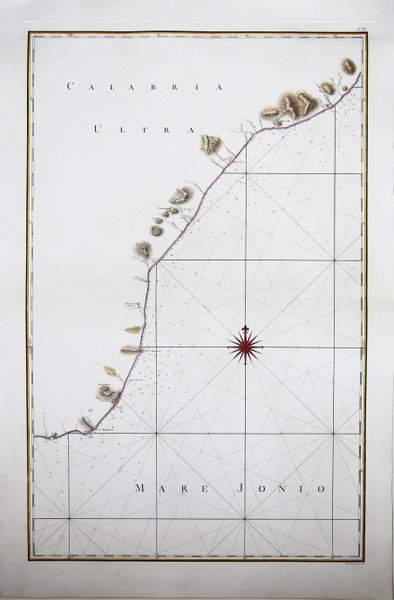 Carta nautica tratta del celebre Atlante Marittimo delle Due Sicilie opera realizzata dal cartografo padovano tra il 1783 ed il 1792. Incisa da Giuseppe Guerra la carta comprende le coste da Roccella a Capo Spartivento. Rizzi Zannoni è considerato come il più importante cartografo italiano dai tempi di Giovanni Antonio Magini. Attivo in Francia , a Padova e soprattutto a Napoli (1781/1814), dove, nel periodo borbonico, poté fregiarsi anche del titolo di "geografo del Re". Con la venuta dei francesi, Rizzi Zannoni continuò ad attendere alla realizzazione delle carte del Regno. Nel 1807, fu posto a capo del Deposito topografico, istituito da Giuseppe Bonaparte; nel 1812, sotto il regno di Gioacchino Murat, riuscì a stampare l'ultimo dei 31 fogli dell'atlante geografico, la cui pubblicazione era iniziata nel 1788. Le opere realizzate a Napoli, in oltre trenta anni di attività, lo consacrarono come il maggiore cartografo italiano dell'età moderna ed uno dei più accreditati in Europa. Incisione in rame, lieve gora d'acqua, per il resto in ottimo stato di conservazione. Bibliografia V. Valerio, ' I Rami dell'Atlante Marittimo. Matrici, disegni, documenti del primo rilievo idrografico del Regno di Napoli. Nautical chart taken from the famous ' Atlante Marittimo delle Due Sicilie ' (Maritime Atlas of the Two Sicilies) by Rizzi Zannoni, printed between 1783 and 1792. Engraved by Giuseppe Guerra. ' Rizzi Zannoni is considered as the most important Italian cartographer since Giovanni Antonio Magini. Active in France, Padua and especially in Naples (1781/1814), where, in the Bourbon period, he could also boast the title of "geographer of the King". With the coming of the French, Rizzi Zannoni continued to attend to the realization of the charts of the Kingdom. In 1807, he was placed in charge of the Topographical Depot, established by Joseph Bonaparte; in 1812, under the reign of Joachim Murat, he managed to print the last of the 31 sheets of the geographical atlas, whose publication had begun in 1788. The works made in Naples, in over thirty years of activity, consecrated him as the greatest Italian cartographer of the modern age and one of the most accredited in Europe. Copper engraving, slight water marks, otherwise in excellent condition. Bibliografia V. Valerio, ' I Rami dell'Atlante Marittimo. Matrici, disegni, documenti del primo rilievo idrografico del Regno di Napoli. Cfr. Valerio, I Rami dell'Atlante Marittimo. Matrici, disegni, documenti del primo rilievo idrografico del Regno di Napoli.