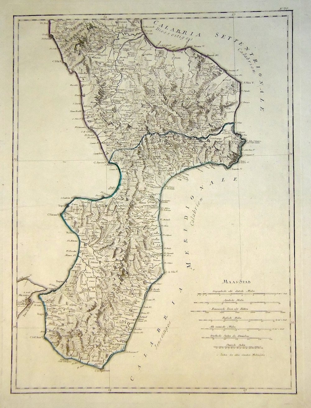 Incisione in rame, mm 610x450, tratta da "Allgemeiner grosser Atlas". Raffigura la regione fino a Cirella, Castrovillari e Cassano a nord. Splendido esemplare con ampi margini.