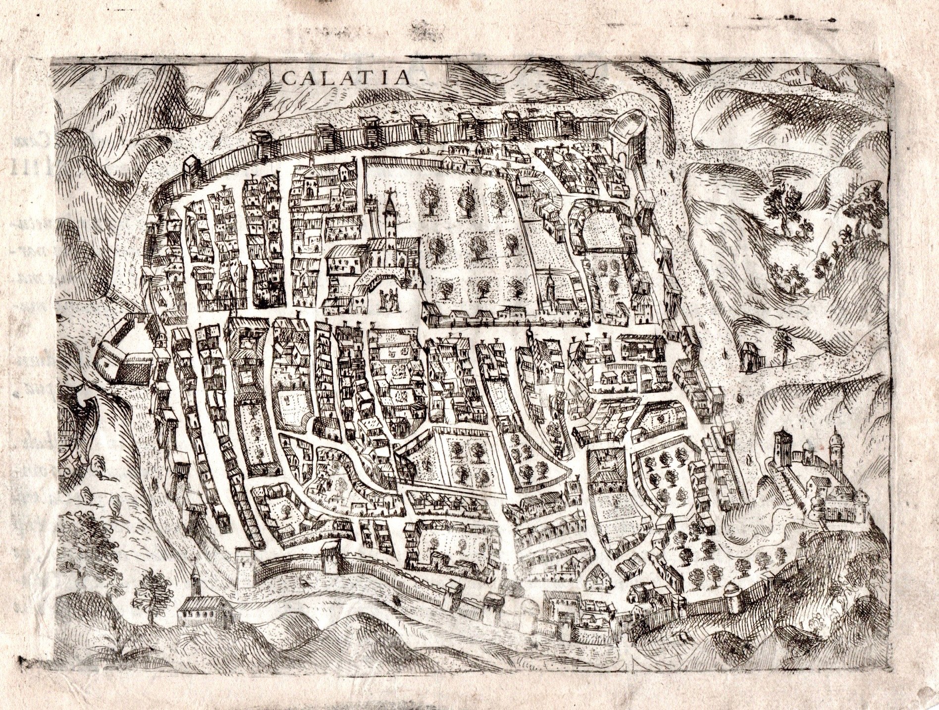 Incisione in rame, dipinta a mano, mm 132x185. Tratta da "Theatrum urbium Italicarum" prima edizione di questa raccolta di piante e vedute di città (senza dubbio da preferire per freschezza di stampa delle lastre alla successiva), ristampata successivamente a Vicenza nel 1616 da Domenico Amadio con l'aggiunta di alcune tavole (67 tavole invece delle 59 originali). Testo latino al verso, di autore ignoto, anche se alcuni studiosi ipotizzano sia dello stesso Bertelli. Esemplare con difetto di stampa a sinistra dove circa 1 cm non è stato impresso <BR>