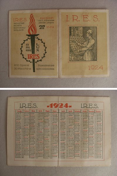 Calendario / calendarietto 1924 I.R.E.S. Industrie Riunite Editoriali Siciliane PALERMO