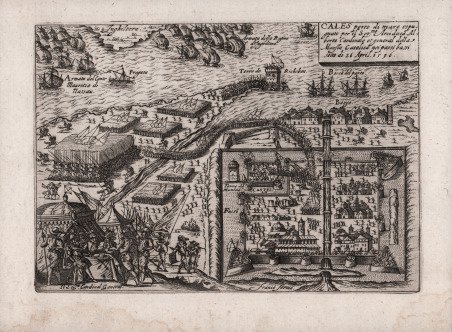 Nel riquadro in alto a destra CALES porto di mare espu/gnato per il Sermo Arciduca Al/berto Cardinale et general della/ Maesta Catolica nei paesi bassi/ sotto di 26 April 1596 In basso a destra, nell’immagine: franco forma L’avvenimento raffigurato nell’incisione – la conquista del porto di Calais da parte degli spagnoli guidati dall’Arciduca Alberto d’Austria – rientra tra gli antecedenti che portarono al vittorioso assedio della città di Hulst (attuali Paesi Bassi), combattuto dalla metà di luglio al 18 agosto 1596, nell'ambito della guerra degli ottant'anni. Calais – che dal 1558 era sotto i Francesi - fu restituita a Enrico IV col trattato di Vervins, nel 1598. ' In basso sulla sinistra, fuori dalla sua tenda è raffigurato il generale Alberto d’Asburgo (1559 – 1621), intorno a un tavolo, intento verosimilmente a discutere con i suoi sottoposti. Sul tavolo si osserva il cappello cardinalizio: all'età di diciassette anni, il 3 marzo 1577, papa Gregorio XIII lo nominò cardinale del titolo di Santa Croce in Gerusalemme ex peculiari gratia. Alla morte del fratello maggiore Ernesto, governatore dei Paesi Bassi spagnoli, Filippo II nominò Alberto al suo posto: l'arciduca partì da Barcellona il 28 agosto del 1595 e prese possesso delle dieci province cattoliche delle Diciassette Province l'11 febbraio 1596. Seppur riluttante, il 31 luglio 1598 rinunciò al cardinalato e agli altri benefici ecclesiastici per sposare sua cugina, l'infanta Isabella Clara Eugenia, figlia di Filippo II: il matrimonio venne celebrato per procura a Ferrara da papa Clemente VIII il 17 dicembre 1598. Alberto assunse così la carica di principe sovrano dei Paesi Bassi meridionali con i titoli di duca di Brabante, Limburgo, Lussemburgo e Gheldria, Conte delle Fiandre, di Artois, Borgogna, Hainaut e Namur. In the cartouche at top right CALES porto di mare espu/gnato per il Sermo Arciduca Al/berto Cardinale et general della/ Maesta Catolica nei paesi bassi/ sotto di 26 April 1596 Bottom right, in the image: franco forma The plate depicts the siege of Calais of 1596 that took place between 8 April and 24 April 1596, as part of the Franco-Spanish War (1595-1598), in the context of the French Wars of Religion, the Anglo-Spanish War (1585–1604), and the Eighty Years' War. The city fell into Spanish hands after a short siege by the Spanish forces commanded by Albert VII, Archduke of Austria and Governor-General of the Spanish Netherlands. Subject then to the Spanish during 2 years, Calais didn't become French again until 2 years later at the treaty of Vervins. ' Below on the left, outside his tent is depicted General Albert of Habsburg (1559 - 1621), around a table, probably intent on discussing with his subordinates. On the table there’s the cardinal's hat: at the age of seventeen, on March 3, 1577, Pope Gregory XIII appointed him cardinal of the title of Santa Croce in Gerusalemme ex peculiari gratia. ' After the death of his elder brother, Ernst, governor of the Netherlands, in February 1595, he was appointed governor-general by Philip and given the task of subduing the rebellious Protestants in the seven United Provinces of the north. At Philip’s insistence, Albert reluctantly obtained a papal release from holy orders and dispensation to marry Philip’s daughter, the infanta Isabel. He received joint sovereignty of the Low Countries in 1598 as dowry for his marriage (April 1599) to Isabel. Cfr.