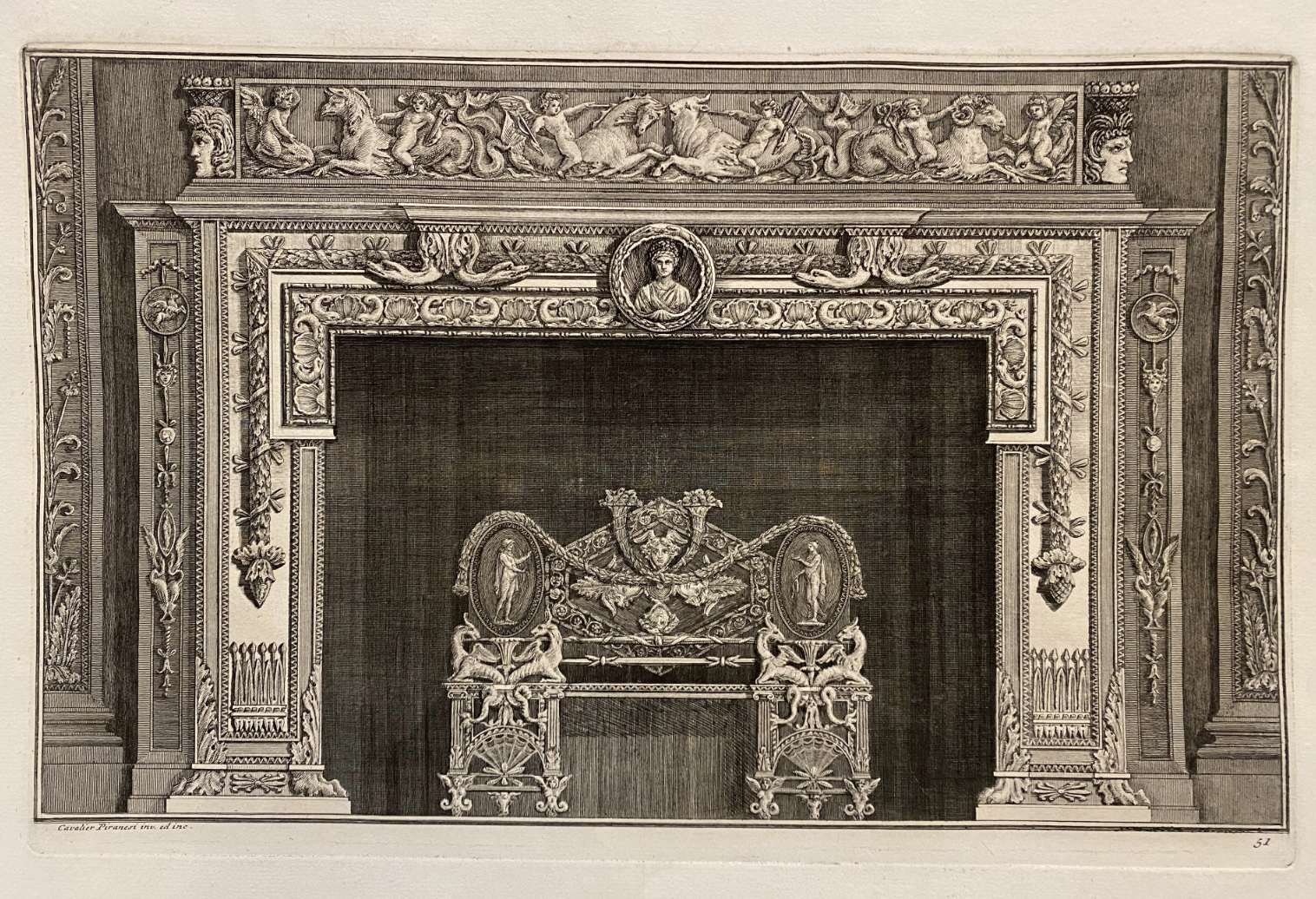 Ciò che colpisce è il risultato: l'abilità di trasmettere nel foglio l'eleganza e raffinatezza degli ornamenti in un rigoroso chiaroscuro. Sul piano del già elaborato camino un rilievo con amorini che cavalcano animali marini. Gli studiosi hanno individuato il modello nella figurazione in un coperchio di sarcofago romano, attualmente di collocazione ignota, ma anticamente facente parte della raccolta della famiglia Soderini visibile nel giardino attorno al Mausoleo di Augusto. (R. Battaglia 1994, p. 225 e nota 80). La decorazione si arricchisce di cigni sulle lesene, di un "imago clipeata" cioè di un ritratto entro cornice tonda, di derivazione funeraria, che si sovrappone a un festone di foglie di alloro, e poi ancora delfini conchiglie e grottesche. Anche il parascintille posto al centro è un'elaborata scultura di gusto classicheggiante. In basso a sinistra inciso: Cavalier Piranesi inv et inc., e a destra il numero 51.