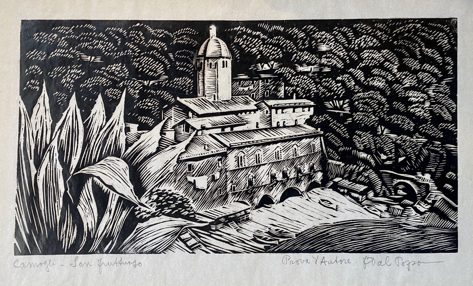 Immerso nel Parco Naturale che da Camogli conduce a Portofino sorge l'antica Abbazia di San Fruttuoso incastonata in un'insenatura naturale. Un tempo ricca e potente è oggi meta turistica, amorevolmente custodita dal FAI. I segni lunghi e decisi scalfiscono il nero cupo della matrice mettendo in risalto l'effetto della luce sulle superfici. La visione è dall'alto, come da un viandante che giungesse da Camogli, la grande pianta d'agave in primo piano a sinistra è un espediente prospettico che da profondità alla composizione. In basso oltre l'immagine a matita: Camogli - San Fruttuoso Prova d'autore. F Dal Pozzo.