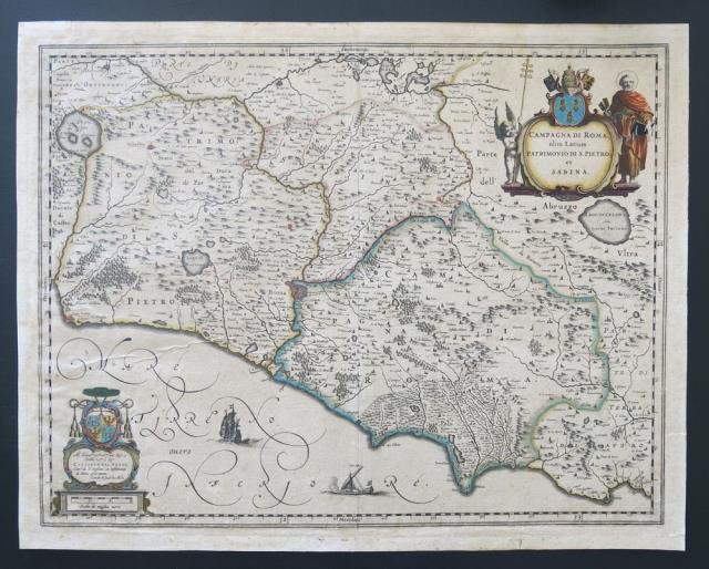 Amsterdam 1630 circa. Incisione in rame all'acquaforte, colore d'epoca (con finiture oro nel cartiglio), cm 39 x 50,5 (il foglio ai margini del perimetro graduato). Titolo in cartiglio in alto a destra, piccolo e ricco cartiglio in basso a sinistra con dedica “All'Ill.mo et Rev.mo et Col.mo Cassiano Del Pozzo Cav.re di Santo Stefano in testimonio di debita observanza Cornelio di Guglielmo Blaeu”, margine graduato, assenza di testo al verso. Nella carta figurano il lago di Bolsena, il lago di Bracciano e si scende fino a Gaeta. Margini rifilati al perimetro graduato (la carta è applicata perfettamente su un foglio coevo sottostante) in piacevole e vivace coloritura coeva, buono stato di conservazione. .