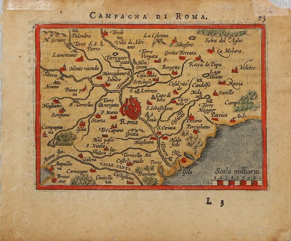 Carta geografica tratta dal "Epitome theatri Orteliani" di Abraham Ortelius. Sei anni dopo la sua prima versione di mappe per l'edizione tascabile dell'Epitome di Ortelius (1577), Philip Galle realizza una seconda serie di tavole che pubblica per la prima volta nel 1583. Tra il 1583 ed il 1593 l'Epitome di Galle fu stampata in più lingue, con titoli diversi.Queste lastre furono poi acquisite da Jan Baptiste Vrients, tra il 1598 e il 1601, il quale corregge le lastre, modificandole o reincidendole, apportando diversi cambiamenti alle mappe e rendendole perciò simili ma differenti a quelle pubblicate nelle precedenti edizioni dell'atlante tascabile.Incisione in rame, finemente colorata a mano, in buono stato di conservazione. Miniature map from the "Epitome thatri Orteliani" by Philippe Galle."Over fifteen years, Philip Galle gradually engraved a second series of miniature plates for his pocket Ortelius atlas and for the most part these have very short titles in capital letters, quite different from the first set. "ey are also altogether plainer and clearer, with less detail and decoration and may be easily distinguished from the first series (see 1577), as they all have plain double-line borders too. "e first eleven were new maps which he introduced in 1583. A further eleven followed in 1585/88 and during the next decade Galle engraved more new ones, till there were fifty one by his final edition of 1598.It is often said that this second series was much better engraved than the first, but in reality they were just drawn in a more plain and less crowded style: it was the way they were drawn that changed.Between 1598 and 1601, Jan B. Vrients acquired the plates and published the last editions of the atlas in 1601 and 1602, with both new and revised plates". [cfr. G. King, Miniature Antique Maps, pp. 64-65].Copperplate, fine later hand colour, some waterstain at left margin, generally in good conditions. Cfr. Koeman: Ortelius 61, G. King, Miniature Antique Maps, pp. 64-65.
