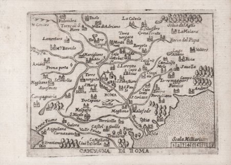 Carta in miniatura preparata per l’edizione italiana dell’Epitome theatri Orteliani, una riduzione delle carte del ' Theatrum Orbis Terrarum ' di Abraham Ortelius, pubblicata per la prima volta ad Anversa da Philip Galle nel 1577 con il titolo di ' Spieghel der werelt ' (Specchio del mondo). Nel 1593, sempre ad Anversa, viene alla luce il ' Theatro del mondo, l’edizione italiana dell’opera curata dal Galle. Nel 1598, Pietro Maria Marchetti, stampa a Brescia il ' Theatro del mondo, edizione “pirata” dell’opera originale del Galle, corredata da 109 mappe fatte incidere copiando le originali. Le carte vengo incise da un anonimo artista e inserite in una pagina di testo in italiano e furono usate anche per illustrare le "Relationi universali di Giovanni Botero", pubblicato sempre in Brescia nel 1599. È nota anche una ristampa delle stesse ' Relationi, pubblicata da Alessandro Vecchi a Venezia nel 1618 e ancora nel "Theatro del mondo" di Giovanni M. Turrini, (1655), e Scipione Banca (1657); queste due ultime edizioni recano il testo descrittivo al verso della carta. Esemplare dall'edizione del 1657 curata da Scipione Banca. Incisione in rame, ' in ottimo stato di conservazione. Rara. Bibliografia G. King, ' Miniature Antique Maps, ' pp. 78-79. Miniature map prepared for the Italian edition of the ' Epitome theatri Orteliani, ' a reduction of the maps of Abraham Ortelius' ' Theatrum Orbis Terrarum, first published in Antwerp by Philip Galle in 1577 under the title ' Spieghel der werelt (Mirror of the World). In 1593, also in Antwerp, the ' Theatro del mondo, ' the Italian edition of the work edited by Galle, came to light. In 1598, Pietro Maria Marchetti, printed in Brescia his ' Theatro del mondo, a "pirate" edition of Galle's original work, accompanied by 109 maps made by copying the originals. The maps were engraved by an anonymous artist and inserted into a page of Italian text and were also used to illustrate Giovanni Botero's "Relationi universali" also published in Brescia in 1599. A reprint of the same ' Relationi ' is also known, published by Alessandro Vecchi in Venice in 1618 and again in Giovanni M. Turrini's "Theatro del mondo" (1655), and Scipione Banca (1657); the latter two editions bear the descriptive text on the verso of the map. Map taken from Scipione Banca's "Theatro del mondo" (1657). Copperplate engraving, in very good condition. Rare. Bibliografia G. King, ' Miniature Antique Maps, ' pp. 78-79. Cfr.