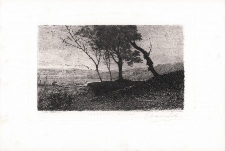 Acquaforte, circa 1870, dimensioni 160 x 255 mm, impressa su carta coeva, in ottimo stato di conservazione. Firma a matita in basso a desta. Dalla attivissima calcografia Lovera di Torino è stampata l'acquaforte di Vittorio Avondo, artista torinese che studiò a Pisa e Ginevra, per poi approdare al naturalismo morbido e sfumato di Fontanesi. Visse anche a Roma dal 1857 al 1865; forse di quel soggiorno resta un ricordo in questa acquaforte della campagna Romana (della quale esistono anche alcuni dipinti in collezione privata), splendido brano intriso di un'atmosfera elegiaca, malinconica, pervaso di una luce vibrante e sfumature delicate. Le acqueforti dell'artista che si conservano non sono molte, forse una decina. Grande collezionista e conoscitore dell’arte medievale e moderna, oltre che pittore paesaggista, Avondo ebbe un ruolo fondamentale nella storia culturale del Piemonte contribuendo, insieme a Alfredo d’Andrade, allo studio e alla tutela del patrimonio artistico del territorio. Importante la sua figura anche per la GAM, egli fu infatti Direttore del Museo Civico di Torino per un lungo periodo, dal 1890 al 1910, e contribuì in modo significativo alla definizione della raccolta d’arte moderna accogliendo ad esempio la donazione delle opere di Antonio Fontanesi. ' ' ' La nascita in una famiglia dalle ampie possibilità economiche gli permise di coltivare a tempo pieno la passione per la pittura di paesaggio e di compiere viaggi per l’Europa che ne arricchirono la formazione. Tappa obbligata di questa educazione, dopo un primo alunnato presso Alexandre Calame a Ginevra concluso nel 1857, fu un lungo soggiorno a Roma che si protrasse sino al 1860 e che si rinnovò intorno al 1865. Qui egli ebbe modo di conoscere Nino Costa e frequentare un ' entourage ' colto e ricco di stimoli in cui spiccavano artisti come Enrico Gamba, Frederic Leighton, George Mason e i tedeschi legati ai ' Deutsch ' Römer, come Anselm Feuerbach, Hans von Marées e lo stesso Böcklin. ' Ma fu sopratutto la sua sensibilità a contatto con il vasto scenario della campagna romana a condurlo a superare lo stile minuzioso e finito appreso in Svizzera, a favore di un nuovo linguaggio scarno ed essenziale, in grado di restituire per sintesi gli ampi orizzonti del paesaggio laziale. In questa svolta pare di cogliere un gusto artistico in rapido cambiamento, in cui si riflette l’interesse per la resa del paesaggio “sul vero” - tema che anima il fronte degli artisti più avanzati di quegli anni - e che pare testimoniata anche dall’acquisto delle prime stampe fotografiche di quei luoghi. Una scelta che la mostra restituisce attraverso alcune preziose carte salate di Giacomo Caneva che fanno parte della generosa eredità dei beni che Vittorio Avondo lasciò alla Città di Torino alla sua morte. ' Il rapporto tra i suoi schizzi, originariamente raccolti in taccuini, e quelle prime immagini fotografiche offre un ulteriore spunto di riflessione su come si modifichi il modo di guardare al paesaggio in quegli anni: uno sguardo che coglie la natura in presa diretta ma che può anche tornarvi in tempi successivi attraverso gli appunti grafici e le prime immagini fotografiche. Una riflessione che porta a interrogarsi sulla stessa funzione del disegno e su scelte e soluzioni che si discostano radicalmente dalla tradizione accademica. ' ' Si apprende da Giubbini che l'opera è stata pubblicata su "L'Arte in Italia" (agosto 1870, tav. 22) con commento di Camerana a p. 128. Riguardo allo stile Giubbini ha commentato molto favorevolmente questa acquaforte, mettendola in relazione con "il gruppo delle incisioni più 'finite' di Appian"; sul piano della tecnica ha osservato: "Da notare che il processo di semplificazione, probabilmente già forte nel passaggio dal disegno preparatorio al disegno tracciato con la punta sulla vernice, continua nelle fasi successive della lavorazione della lastra attraverso la mancata o parziale morsura di molti dei segni . Etching, circa 1870, size 160 x 255 mm, impressed on coeval paper, in excellent condition. Signature in pencil in the lower right corner. Printed by chalcography Lovera in Turin. Light, and brilliant landscape with the poetical expression of trees, that recalls the traditional Italian painting of the XIX century. The work is characterized by a well-balanced lightening which created a strong feeling of the scene, with the movement of trees in the wind through intense black made shadows and light in far behind of landscapae. Vittorio Avondo, an artist from Turin who studied in Pisa and Geneva, and then came to the soft and nuanced naturalism of Fontanesi. He also lived in Rome from 1857 to 1865; perhaps a memory of that stay remains in this etching of the Roman Campagna (of which there are also some paintings in a private collection), a splendid piece imbued with an elegiac, melancholic atmosphere, pervaded by a vibrant light and delicate nuances. The etchings of the artist that are preserved are not many, perhaps a dozen. We learn from Giubbini that the work was published in "L'Arte in Italia" (August 1870, table 22) with a comment by Camerana on p. 128. Regarding the style, Giubbini commented very favorably on this etching, relating it to "the group of Appian's most 'finished' etchings"; as far as technique is concerned, he observed: "It should be noted that the process of simplification, probably already strong in the passage from the preparatory drawing to the drawing traced with the tip on the varnish, continues in the successive phases of the working of the plate through the lack or partial biting of many of the marks corresponding to the branches of the trees". A great collector and connoisseur of medieval and modern art, as well as a landscape painter, Avondo (1836 – 1910) played a fundamental role in the cultural history of Piedmont, contributing, together with Alfredo d'Andrade, to the study and protection of the artistic heritage of the territory. He devoted hi