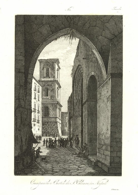 Veduta, animata da personaggi, del Campanile e Cortile di S. Chiara in Napoli. Stampa antica originale