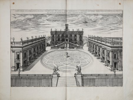Acquaforte, 1569, titolata, firmata e datata in alto: CAPITOLII SCIOGRAPHIA EX IPSO EXEMPLARI MICHAELIS ANGELI BONAROTI A STEPHANO DVPERAC PARISIENSI ACCVRATE DELINEATA ET IN LVCEM AEDITA ROMAE ANNO SALUTATIS ? DLXIX [Sciografia del Campidoglio delineata dal parigino Stefano du Pérac in base allo stesso esemplare di Michelangelo Buonarroti, pubblicata a Roma nell’anno 1569]. Esemplare nel primo stato di cinque per Rubach (primo di due per Alberti), avanti l’indirizzo di Claudio Duchetti. Rubach descrive le successive ristampe curate da Giovanni Orlandi e Hendrick van Schoel. Magnifica prova, ricca di toni, impressa su carta vergata coeva con filigrana “tulipani in scudo con stella” (cfr. Woodward nn. 124-125), rifilata al rame e con margini coevi aggiunti, in eccellente stato di conservazione. Questa tavola incisa da Etienne Duperac per Lafreri nel 1569, deriva dall’analoga incisione che l’incisore francese realizza l’anno prima (1568) per l’editore Bartolomeo Faleti (cfr. Marigliani n. VI.5). Nella seconda ristampa di Claudio Duchetti (databile al 1581-85) vengono aggiunti sulla balaustra della terrazza i Trofei di Mario. “La pubblicazione delle opere architettoniche che Michelangelo realizzava all’interno della Città Eterna veniva pubblicizzata attraverso una serie di incisioni per iniziativa della sua cerchia ristretta: Calcagni, Vasari e de’ Cavalieri. Proprio Tiberio Calcagni ebbe l’incarico di preparare le stampe da pubblicare. Ma dopo l’insuccesso editoriale della prima incisione la Cappella del re di Francia in San Pietro per i tipi di Vincenzo Luchino nel 1564 l’impresa venne raccolta da Étienne Du Pérac che la realizzò per i tipi di Antonio Lafréry che aveva una grande capacità commerciale. Du Pérac come per le incisioni di San Pietro anche in quelle del Campidoglio si basa approssimativamente sulle idee di Michelangelo. «Senza dubbio, le incisioni difficilmente possono essere considerate un’esatta riproduzione di un disegno di mano di Michelangelo; a quel che sappiamo, egli non diede mai corpo alle sue idee in un disegno definitivo per alcuno dei suoi edifici. Dupérac tentò certamente di combinare le parti riconoscibili degli edifici ancora incompiuti con ciò che aveva saputo o immaginato delle intenzioni di Michelangelo, ovviamente restituendo in modo corretto le caratteristiche principali del progetto». Le statue collocate sopra la balaustra avevano la finalità di trasmettere un messaggio propagandistico, che tramandasse insieme la passione del collezionismo e il collegamento con la grandezza della storia della Città Eterna. In questa incisione mancano i cosiddetti trofei di Mario, aggiunti nelle successive varianti” (cfr. Marigliani, ' Lo splendore di Roma nell’Arte incisoria del Cinquecento). L’opera appartiene allo ' Speculum Romanae Magnificentiae, la prima iconografia della Roma antica. La lastra figura nell'Indice del Lafreri al n. 267, descritta come ' Dissegno del Campi¬doglio nuouo architettura di Mich. Ang. Lo ' Speculum ' ebbe origine nelle attività editoriali di Antonio Salamanca e Antonio Lafreri (Lafrery). Durante la loro carriera editoriale romana, i due editori - che hanno lavorato insieme tra il 1553 e il 1563 - hanno avviato la produzione di stampe di architettura, statuaria e vedutistica della città legate alla Roma antica e moderna. Le stampe potevano essere acquistate individualmente da turisti e collezionisti, ma venivano anche acquistate in gruppi più grandi che erano spesso legati insieme in un album. Nel 1573, Lafreri commissionò a questo scopo un frontespizio, dove compare per la prima volta il titolo Speculum Romanae Magnificentiae. Alla morte di Lafreri, due terzi delle lastre di rame esistenti andarono alla famiglia Duchetti (Claudio e Stefano), mentre un altro terzo fu distribuito tra diversi editori. Claudio Duchetti continuò l’attività editoriale, implementando le lastre dello Speculum con copie di quelle “perdu. Etching, 1569, titled, signed, and dated at top: CAPITOLII SCIOGRAPHIA EX IPSO EXEMPLARI MICHAELIS ANGELI BONAROTI A STEPHANO DVPERAC PARISIENSI ACCVRATE DELINEATA ET IN LVCEM AEDITA ROMAE ANNO SALUTATIS ? DLXIX Example in the first state of five for Rubach (first of two for Alberti), before Claudio Duchetti's address. Rubach describes later reprints edited by Giovanni Orlandi and Hendrick van Schoel. Magnificent proof, richly toned, printed on contemporary laid paper with "tulips in shield with star" watermark (see Woodward nos. 124-125), trimmed to copperplate and with contemporary margins added, in excellent condition. This plate engraved by Etienne Duperac for Lafreri in 1569 is derived from the similar engraving the French engraver made the year before (1568) for the publisher Bartolomeo Faleti (cf. Marigliani n. VI.5). In the second state printed by Claudio Duchetti (datable to 1581-85) the Trophies of Mario are added on the balustrade of the terrace. “The publication of the architectural works that Michelangelo carried out within the Eternal City was publicized through a series of engravings through the initiative of his inner circle: Calcagni, Vasari and de' Cavalieri. Tiberio Calcagni himself was commissioned to prepare the prints for publication. But after the editorial failure of the first engraving the Chapel of the King of France in St. Peter's for the types of Vincenzo Luchino in 1564 the project was picked up by Étienne Du Pérac who produced it for Antonio Lafréry, who had great commercial ability. Du Pérac as with the engravings of St. Peter's also in those of the Capitoline Hill roughly based himself on Michelangelo's ideas. Undoubtedly, the engravings can hardly be considered an exact reproduction of a drawing by Michelangelo's hand; to what we know, he never gave substance to his ideas in a definitive design for any of his buildings. Dupérac certainly attempted to combine the recognizable parts of the still unfinished buildings with what he had kno