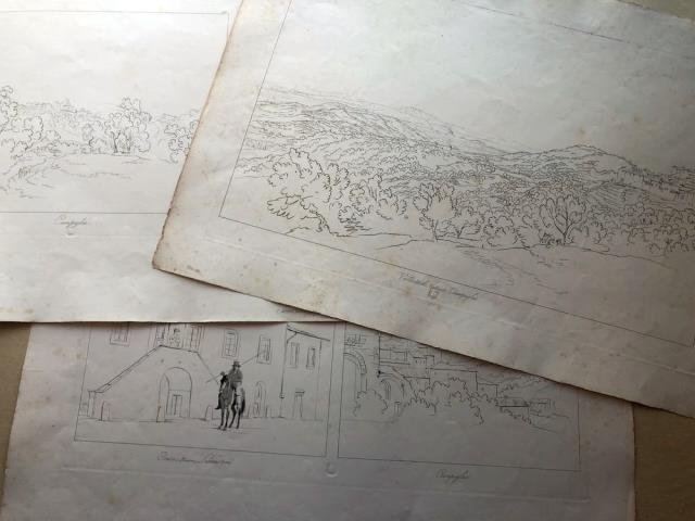 Dal "Viaggio Pittorico nelle Maremme Toscane e all'Isola dell'Elba disegnato da Carlo Muller Pittore Paesista Svizzero. Inciso e pubblicato da Fortunato De Fournier. Con opportune illustrazioni ed alcuni cenni sulla vita di questo celebre artista in italiano e in francese". Firenze, 1835. La prima tavola: incisione in rame all'acquaforte in delineato, b/n cm 29 x 34,5 circa (alla lastra) più margini bianchi, titolo corsivo "Campiglia" al centro del margine inferiore. Da questa pubblicazione, difficile a reperirsi, rara veduta di Campiglia (non ancora Campiglia Marittima), con il paese arroccato sulla sinistra del foglio e la chiesina di San Giovanni sul lato opposto, alla destra del foglio, poi la vegetazione marittima in primo piano. La seconda tavola, composta di due scene separate: incisione in rame all'acquaforte in delineato e all'acquatinta (la prima scena) e incisione in rame all'acquaforte in delineato (la seconda scena), cm 27,5 x 55 (alla lastra) più margini bianchi, titoli corsivi "Casa (Maison) Serristori" e "Campiglia" al centro del margine inferiore; l'una scena è animata con uomo a cavallo difronte alla villa, l'altra fa vedere uno uno scorcio del borgo. La terza tavola: incisione in rame all'acquaforte in delineato, cm 38 x 56 (alla lastra) più margini bianchi, titolo corsivo "Vallata di (Vallée de) Campiglia" al centro del margine inferiore; la tavola presenta il paese arroccato sulla destra del foglio, un' ampia veduta della vallata con al centro, isolata, l'affascinante chiesetta di San Giovanni. Rare. Un leggero foxing e strappetti marginali ma fogli in buono stato di conservazione.