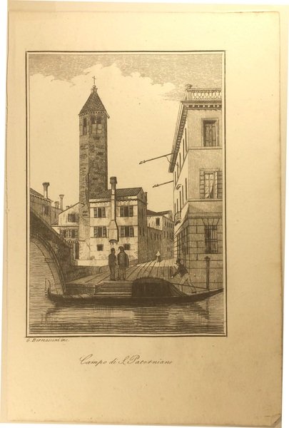 Acquaforte su rame di mm 190 x 130.L'incisione è tratta dalla famosa guida ottocentesca elogiata dal Cicogna per l'accuratezza descrittiva:" Il Fiore di Venezia ossia i quadri, i monumenti, le vedute ed i costumi veneziani rappresentati in incisioni eseguite da abili artisti ed illustrati da Ermolao Paoletti." Cicogna n. 4503