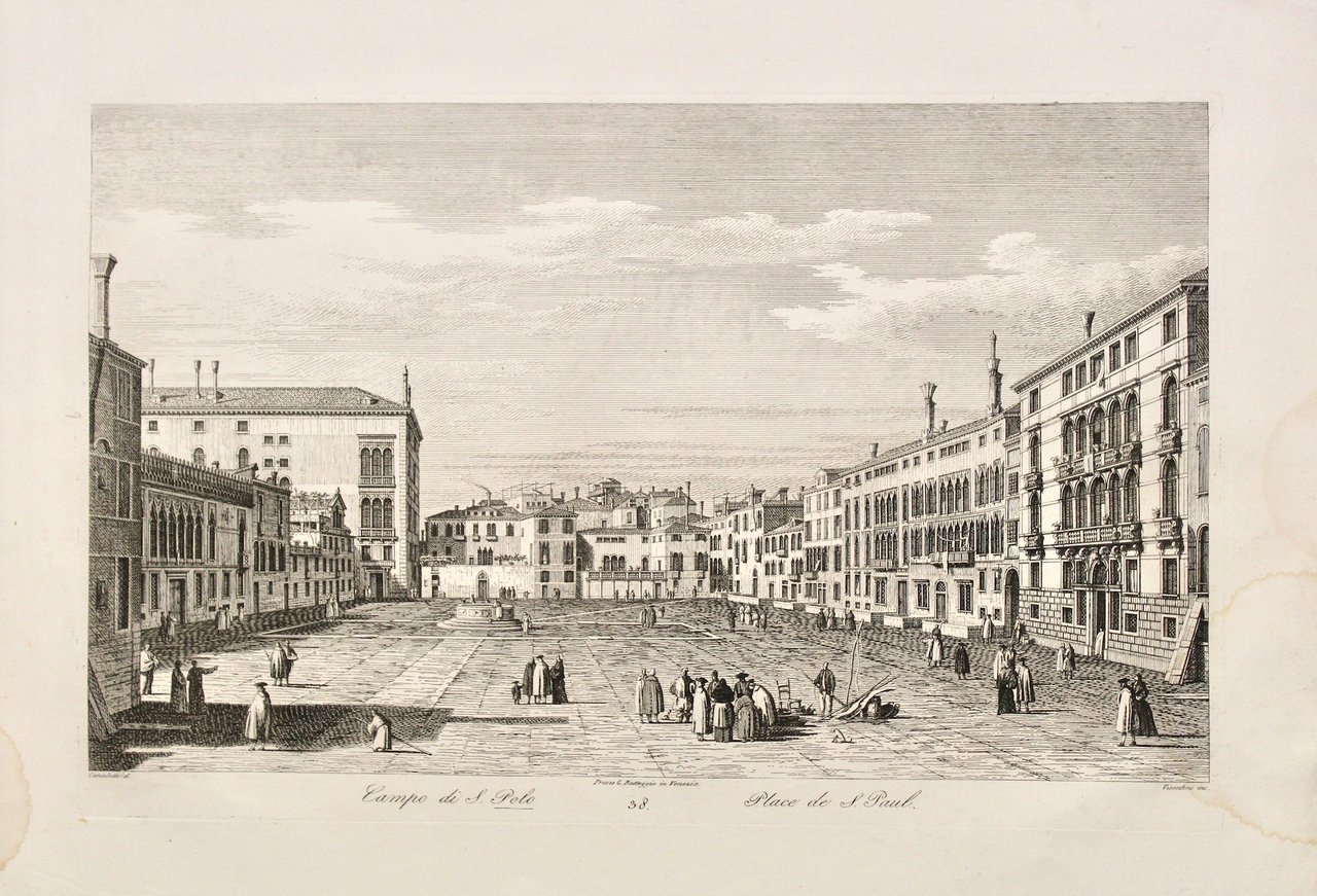 Incisione in rame, mm 250x420 c. (l’inciso) Tratta da “Urbis Venetiarum prospectus celebriores ex Antonii Canal tabulis XXXVIII…” la cui prima edizione completa fu pubblicata nel 1742, poi ristampata più volte nel corso del secolo da Furlanetto e Viero oltre che da Battaggia nel XIX secolo. Stato II/IV, prima edizione pubblicata da Giuseppe Battaggia. Ottimo esemplare con lieve alone marginale a destra. Succi, La Serenissima nello specchio di rame, vol I, p. 211 € 400 Copper engraving, mm 250x420 c. (engraved area). Copper engraving, mm 250x420 c. (engraved area)<BR>From "Urbis Venetiarum prospectus celebriores ex Antonii Canal tabulis XXXVIII…" first published in 1742 and then by Furlanetto e Viero in the XVIII century and Battaggia in the XIX c. State II/IV, First Giuseppe Battaggia's edition. Very good condition with light water stain in right margin. Succi, La Serenissima nello specchio di rame, vol I, p. 211