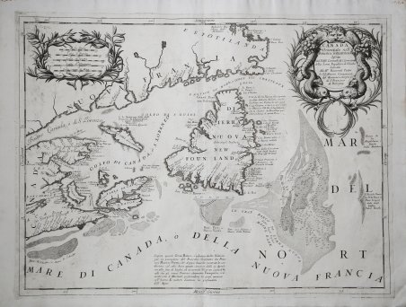 Carta dettagliata di Terranova, Labrador, Nuova Scozia e del Golfo di San Lorenzo, di Vincenzo Coronelli. Mostra la foce del San Lorenzo, con Terranova, l'isola di Capo Breton, parti della Nuova Scozia e la costa del Canada. Coronelli ha ricavato le sue informazioni da quelle di Jean Baptiste Nolin, che aveva pubblicato una carta simile, a Parigi, dieci anni prima. I pesci che circondano il cartiglio sono un'evidente allusione all'industria principale della regione. La carta di Coronelli comprende un'elaborata rappresentazione del Grand Bank, con numerosi scandagli e una rigatura differenziata per indicare le varie altitudini. È insolito, in una carta antica, vedere una topografia subacquea così accurata. Opera tratta dal ' Corso geografico universale, o sia la terra divisa nelle sue parti e subdistinta ne' suoi gran regni. Esposta in tavole geografiche ricorrette et accresciute di tutte le nuove scoperte, ad uso dell'Accademia Cosmografica degli Argonauti dal Padre Maestro Vincenzo Coronelli M. C. Cosmografo della Serenissima Republica di Venetia. Dedicata alla Santità di Nostro Signore Innocenzo XII. P. I. In Venetia, a spese dell'autore. MDCXCII. Coronelli visse un periodo di straordinaria fecondità editoriale a partire dal 1689, quando ebbe la cattedra di geografia presso l'Università alle Procuratie, con la pubblicazione, nel 1690, del primo volume dell'Atlante Veneto. In effetti sotto il nome di ' Atlante Veneto ' va tutta la raccolta di tredici opere composte nell'arco del decennio successivo, dall'Isolario ' allo ' Specchio del mare. In realtà solo alcune di tali opere possono definirsi atlante, e sono di valore molto disuguale, dato che si passa da opere originali e fondamentali come quelle citate o il ' Corso Geografico ' ad opere di compilazione o semplici raccolte di vedute. Il ' Corso Geografico ' uscì in diverse edizioni con numeri diversi di carte - sessantotto tavole nel 1689-92; di centosettantatré tavole nel 1692; duecentosessanta tavole, nel 1694-97 - che venivano vendute anche separatamente, al ritmo di sei carte al mese per due anni. Le carte furono incise tra il 1688 e il 1692 nell'attrezzatissima officina cartografica del convento dei Frari, dove lavoravano anche incisori stranieri. ' Incisione in rame in perfette condizioni. Detailed map of the Newfoundland, Labrador, Nova Scotia and the Gulf of St. Lawrence, by Vincenzo Coronelli. Showing the mouth of the St. Laurence, with Newfoundland, Cape Breton Island, and parts of Nova Scotia and the Coast of Canada. Coronelli derived his information from that of Nolin, who had published a similar map in Paris ten years earlier. The fish surrounding the cartouche are an obvious allusion to the main industry of the region. Coronelli's mapping includes an elaborate depiction of the Grand Bank with numerous soundings and differentiated stippling to indicate various elevations. It is unusual to see underwater topography render at such high definition. The map is taken from ' Corso geografico universale, o sia la terra divisa nelle sue parti e subdistinta ne' suoi gran regni. Esposta in tavole geografiche ricorrette et accresciute di tutte le nuove scoperte, ad uso dell'Accademia Cosmografica degli Argonauti dal Padre Maestro Vincenzo Coronelli M. C. Cosmografo della Serenissima Republica di Venetia. Dedicata alla Santità di Nostro Signore Innocenzo XII. P. I. In Venetia, a spese dell'autore. MDCXCII. Coronelli lived a period of extraordinary editorial fecundity starting from 1689, when he had the chair of geography at the University at the Procuratie, with the publication, in 1690, of the first volume of the ' Atlante Veneto. Under the name of ' Atlante Veneto ' goes the entire collection of thirteen works composed over the next decade, from the ' Isolario ' to the ' Specchio del mare. ' In reality, only some of these works can be defined as atlas, and are of very unequal value, since we go from original and fundamental works such as those mentioned or the ' Corso Geografico ' to works of compilation or simple collections of views. The ' Corso Geografico ' came out in several editions with different numbers of maps - sixty-eight maps in 1689-92; one hundred and seventy-three maps in 1692; two hundred and sixty maps in 1694-97 - which were also sold separately, at the rate of six a month for two years. The maps were alle engraved between 1688 and 1692 in the well-equipped cartographic workshop of the Frari convent, where foreign engravers also worked. ' Copper engraving in perfect condition. Cfr. Kershaw (Canada) 162.