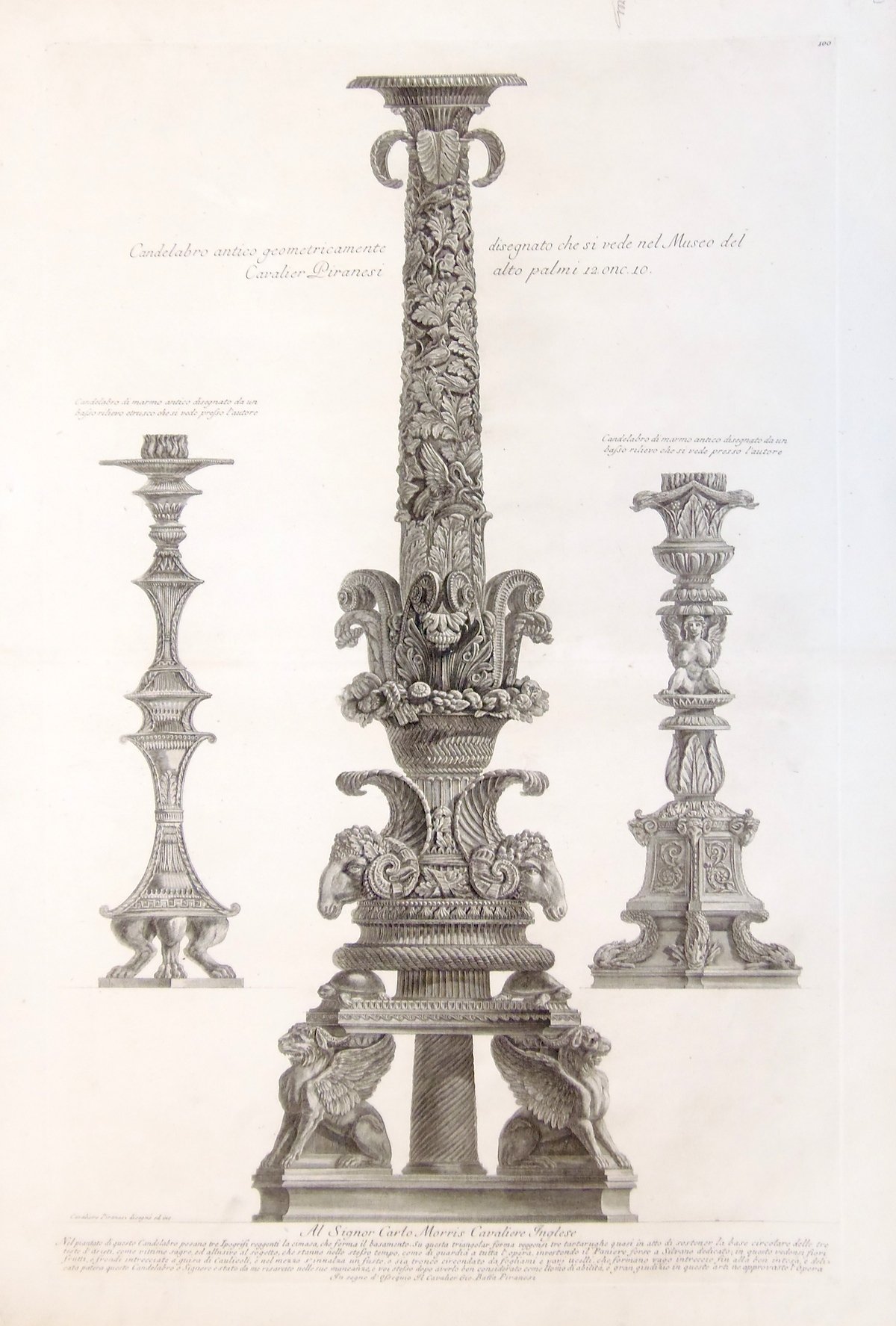 Acquaforte, bulino e puntasecca da "Vasi, candelabri, cippi…", stampato nel 1778. Bella prova con ampi margini, impressa su carta vergata con filigrana con doppio giglio (Hind 2), traccia di piega centrale con leggera ossidazione, ben conservata. Mm: 434x640. Così cita il Piranesi al piede dell'incisione nella dedica :Al signor Carlo Morris Cavaliere Inglese "Nel piantato di questo candelabro posano tre Ipogrifi reggenti la cimasa, che forma il basamento. Su questa triangolar forma veggonsi tre tartarughe qusi in atto di sostener la base circolare delle tre teste d'arieti, come vittime sagre, ed allusive al sogetto che stanno nello stesso tempo, come di guardia a tutta l'opera, investendo il Paniere forse a Silvano dedicato, in questi vedonsi i fiori frutti e frondi intrecciate a guisa di Caulicoli, e nel mezzo s'innalza un fusto, o sia tronco circondato da fogliami e varj uccelli, che formano vago intreccio fin alla ben intesa e delicata patera.<BR>