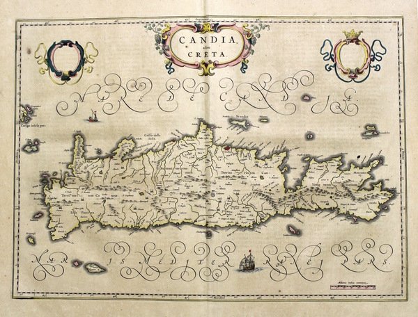 Incisione in rame, mm 385x535, testo latino al verso. Elegante e piacevole carta, arricchita da cartigli, navi e stemmi. Ottimo esemplare perfettamente conservata anche se lievemente ingiallita. W. Blaeu, astronomo allievo di Tycho Brahe, fondò un'officina per la costruzione di globi nel 1599; quasi immediatamente iniziò a pubblicare anche carte geografiche, giungendo nel 1630 alla creazione del primo atlante "Atlantis Appendix" e cinque anni dopo, della prima edizione in due tomi del "Atlas Novus". Dopo la sua morte nel 1638, a cura del figlio Johan si giunse nel 1662 alla pubblicazione del celebre "Atlas Maior" in 11 volumi. Nel 1672 un incendio distrusse l'officina e segnò la fine dell'attività. <BR>Copper engraving, mm 385x535, latin text on verso. Good condition even if slightly discolored. W. Blaeu, born in Alkmaar in 1571, studied astronomy by Tycho Brahe and founded a business in 1599 as a globe and instrument maker. He immediately expanded the business publishing maps and in 1630 the first atlas "Atlantis appendix" and five years later the "Atlas novus". After his death in 1638, his son Joan reached publication of the major work of the family, the "Atlas maior" in 11 volumes. In 1672 a great fire destroyed the Blaeu's printing house. <BR><BR>