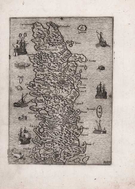Carta geografica dell’isola di Creta firmata e datata in lastra dal Nelli. La carta dell’isola di Creta di Nicolò Nelli è basata sul modello di Zorzi/Pagano del 1538. Differisce per l’orientazione, qui con l’est in alto come in molte altre carte veneziane del periodo. L’isola è rappresentata con la flotta veneziana chierata a difesa contro gli assalti dei turchi. La carta venne in seguito inserita nel Isole che son da Venetia nella Dalmatia et per tutto l’arcipelago fino a Costantinopoli, edito da Simone Pinargenti a Venezia nel 1573. L’opera fu realizzata in stretta concorrenza con l’analoga raccolta del Camocio Isole Famose, e raccoglie carte incise da Nicolò Nelli, Natale Bonifacio e dal Pinargenti stesso. I pochi esemplari noti della raccolta sono spesso diversi tra loro, e contengono un numero variabile di carte. Bellissima prova, impressa su carta vergata coeva con filigrana “sirena in uno scudo con stella”, in perfetto stato di conservazione. This very-rare loose-sheet map of Crete carries at the lower right hand corner the name of the Venetian engraver Nicolò Nelli, and the date of the publication, 1570. Like the larger maps of The IATO these smaller ones were first issued for a loose sheet circulation, and then assembled in booklet form for interested customer. The island is shown surrounded by an armada of Venetian war ships. The map is oriented with east at the top and its shape is based on the Matteo Pagano map of the island (1538). Sometimes the map appear in the rare collection by Simone Pinargenti “Isole che son da Venetia nella Dalmatia et per tutto l’arcipelago fino a Costantinopoli” (1573). Nicolò Nelli (1530 ca – 1573) was venetian engraver of maps, portraits, religious subject and prints. He also traded in prints and published the works of Giovanni Battista Fontana and Giorgio Ghisi and had a business relationship with Bertelli en Zaltieri. Copperplate, wide margins, perfect condition. Very rare. Cfr. Tavernari (2014): n. 75; Zacharakis (1992): n. 1601; Zacharakis (2009): n. 2469.