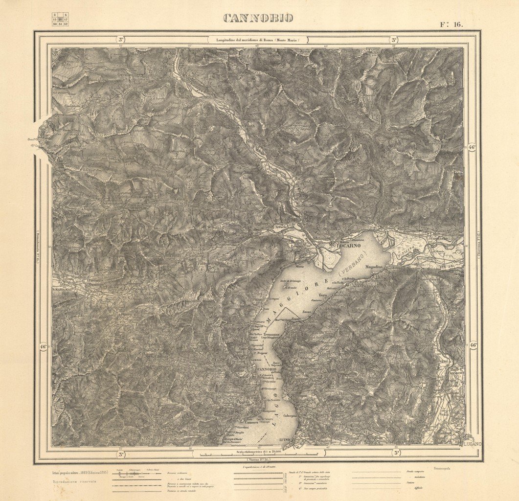 Carta geografica, antica ed originale, in scala 1:75000 raffigurante l'alto Verbano e valli adiacenti in modo particolare vengono riportate le cittadine di: Cannobio, Luino, Tronzano, Magadino, Locarno, S. Maria Maggiore, Craveggia, Finero, Intragna, Coglio, Maggia, ecc. Edizione del 1895. Autore: Istituto Geografico Militare. Luogo: Lago Maggiore - Cannobbio. Anno: 1893. Tecnica: fotozincografia. Dimensioni: 535x550 mm