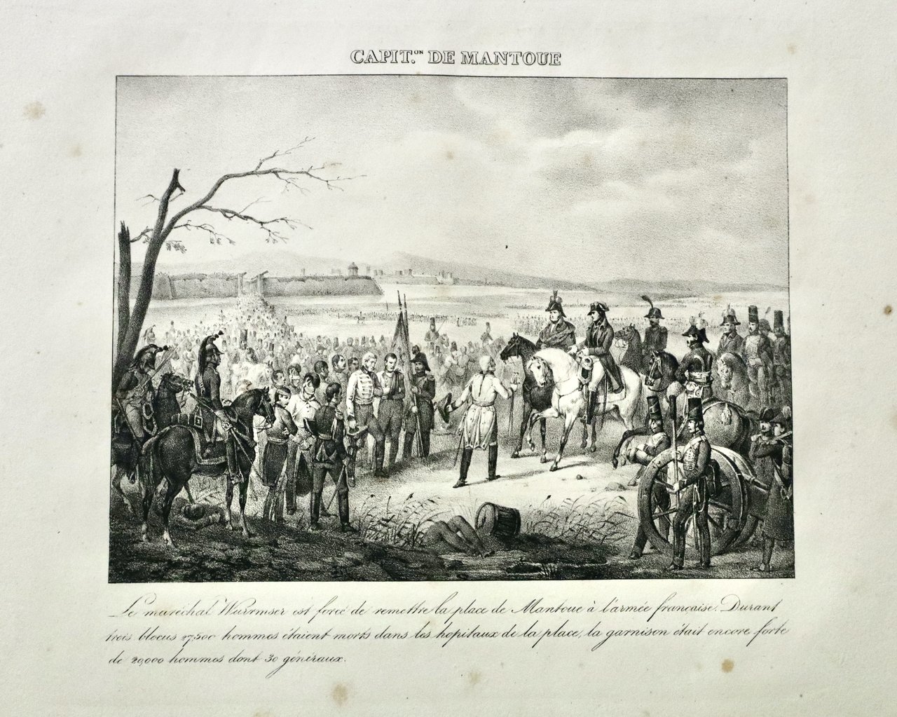 Litografia, mm 150x200. Non comune edizione del soggetto delineato da Adam originariamente per l'opera "Vie politique et militare de Napoléon" di Antoine Arnauld. Raffigura il maresciallo Wurmser mentre si arrende a Napoleone. Questa edizione è in formato ridotto e successivo alla succitata, ma di maggiore rarità. Ottimo esemplare marginoso con saltuarie fioriture marginali della carta. Ferrari, Mantova nelle stampe, 149 (per l'edizione in Folio dell'opera).
