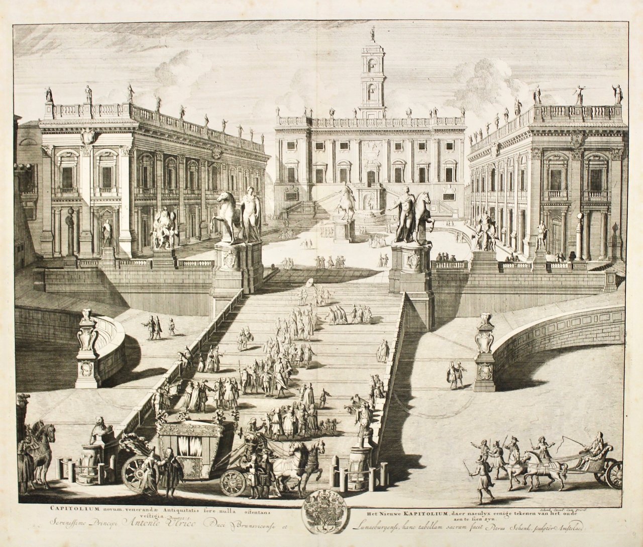 Incisione in rame, mm 497x606 (lastra) e mm 541x630 (foglio). Rara e spettacolare veduta di piazza del Campidoglio. Perfette condizioni. Copper engraving, mm 497x606 (platermark) and mm 541x630 (sheet). Signed "Schenk excud. Cum Privil" in the plate bottom right. Large view of the Capitolium. Perfect condition. <BR><BR>
