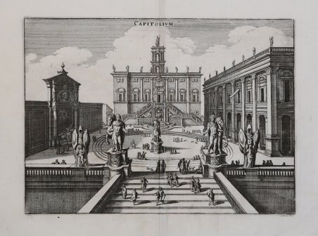 Tavola pubblicata nell'opera "Newe Archontologia Cosmica" di Johann Philip Zabelin, meglio conosciuto con lo pseudonimo di J.L.Gottfried, arricchita dalle tavole di Mattheus Merian. La "Neuwe Archontologia cosmica, Das ist Beschreibung aller Kayserthumben Königreichen und Republiken der gantzen Welt [.]", viene pubblicata a Francoforte nel 1638, ristampato in lingua latina nel 1638 e nel 1649 e in lingua tedesca nel 1646 e nel 1695. Le tavole di Merian sembrano siano state pubblicate anche separatamente; confluirono poi nel “Theatrum Europaeum” una sorta di giornale sulla storia delle terra, in lingua tedesca, iniziato da Matthäus Merian e proseguito poi da altre editori, che venne pubblicato tra il 1633 e il 1738 [in 21 volumi in quarto]. ' Matthäus Merian il vecchio (1593-1650) incisore svizzero nativo di Basilea, lavorò a Francoforte dove ebbe modo di lavorare nella bottega fondata da Theodor de Bry. Merian si segnalò, tanto da sposare Maria Magdalena de Bry, figlia di Johann Theodore de Bry, e dal 1625 circa da prendere in mano l'azienda, dandole un notevole incremento ed occupandosi in particolare dello sviluppo dei libri di topografia e di viaggi. Nella tipografia Merian lavorarono anche i figli Kaspar e soprattutto il quotato Matthaeus il giovane, i quali dopo la morte del padre proseguirono con immutato successo la gestione dell'attività che continuò fino al 1727. Nel 1638 Merian stampò la Neuwe Archontologia cosmica, das ist, Beschreibung aller Kaÿserthumben, Königreichen und Republicken der gantzen Welt opera sulla descrizione del Mondo già uscita dieci anni prima con una veste modesta che Merian rivoluzionò arricchendola con 98 tavole alcune delle quali a doppio foglio. L'Archontologia conobbe altre quattro edizioni fino al 1695 con testo o in latino o in tedesco, non omogenee per numero e tipologia di incisioni inserite. Nel 1640 venne pubblicato Itinerarium Italiæ Nov-antiquæ scritto da Martin Zeiller, ristampato nel 1688 col titolo Topographiæ Italiæ. Incisione in rame, in buono stato di conservazione. View of the Campidoglio, first published in Johann Ludwig Gottfried "Neuwe Archontologia Cosmica.", first published by Matthias Merian in 1638, and reissued in numerous later editions. The print seems also to have been published separately. Then it was included in the “Theatrum Europaeum”, a journal on the history of the German-speaking lands by Matthäus Merian, published between 1633 and 1738 in 21 quarto volumes. Matthäus Merian the Elder (1593-1650) Swiss engraver native of Basel, worked in Frankfurt where he was able to work in the workshop founded by Theodor de Bry. Merian distinguished himself, so much so that he married Maria Magdalena de Bry, daughter of Johann Theodore de Bry, and from about 1625 he took over the company, giving it a considerable increase and dealing in particular with the development of topography and travel books. The Kaspar sons and above all the renowned Matthaeus the younger also worked in the Merian typography, who after the death of their father continued with unchanged success the management of the business which continued until 1727. In 1638 Merian printed the Neuwe Archontologia cosmica, das ist, Beschreibung aller Kaÿserthumben, Königreichen und Republicken der gantzen Welt works on the description of the World already published ten years earlier with a modest look that Merian revolutionized by enriching it with 98 tables, some of which are double sheets. The Archontologia went through four other editions up to 1695 with text either in Latin or in German, not homogeneous in terms of the number and type of engravings inserted. In 1640 Itinerarium Italiæ Nov-antiquæ written by Martin Zeiller was published, reprinted in 1688 with the title Topographiæ Italiæ. Etching, very good condition. Cfr.