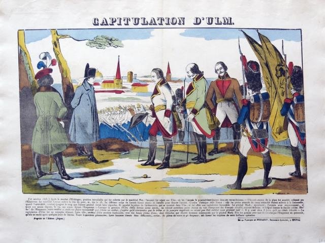 Epinal, Jean Charles Pellerin, seconda metà del XIX secolo (1877 circa). Incisione su legno in coloritura d'epoca, cm 48 x 63 circa (il foglio). La veduta è stata incisa dal Georgin e stampata dal Pellerin, il più importante editore di Epinal, cittadina del dipartimento dei Vosgi, nella regione della Lorena. Al margine inferiore la didascalia descrittiva dell'episodio: si raffigura la capitolazione di Ulm, uno degli esiti finali della battaglia di Ulm, combattuta nel 1805, con una straordinria con inaria vittoria per Napoleone, conclusasi con la distruzione di un'intera armata austriaca. Piega centrale editoriale, bella coloritura e ottima conservazione.