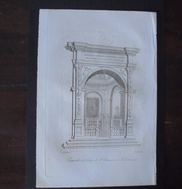 Tratta da Scipione Volpicella Storia del Monumenti. Incisione di mm. 120 x 180 (=lxh) più margini. Firmata in basso a sinistra; Cosentini, e a destra; Martorani.