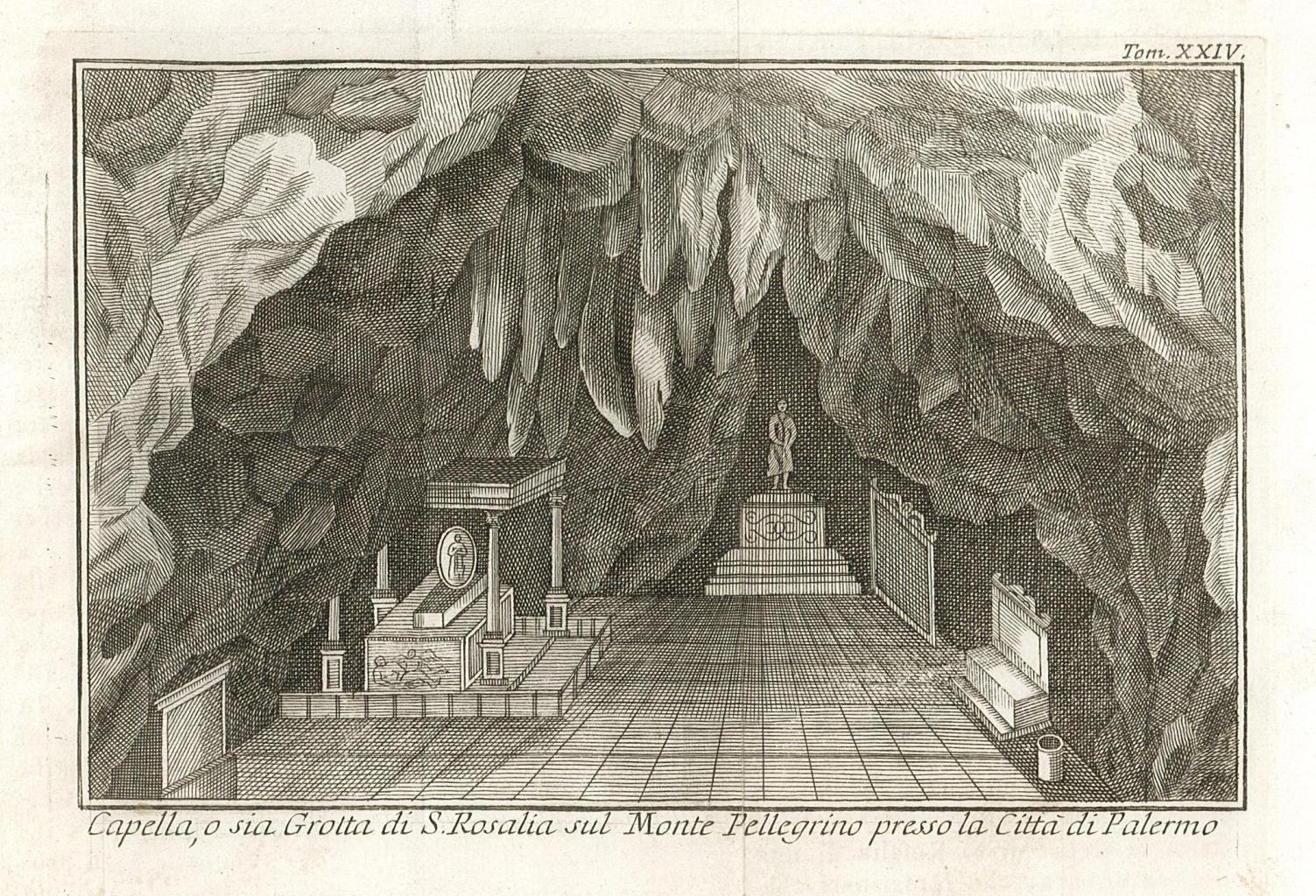 Stampa, antica ed originale, con veduta dell'interno della Capella o Grotta di S. Rosalia sul Monte Pellegrino presso la città di Palermo. Autore: Salmon Thomas. Luogo: Palermo. Anno: 1762. Tecnica: incisione in rame. Dimensioni: 100x157. Tratta dall'opera "Lo stato Presente di tutti i Paesi del Mondo Naturale, ." vol. XXIV. Stampata in Venezia presso Giambattista AlbrizziPieghe editoriali