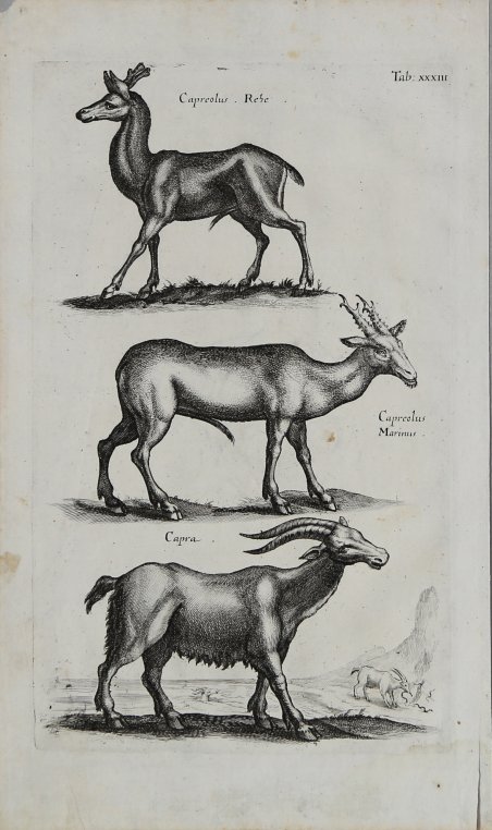 Tavola tratta da Historia Naturalis de quadrupetibus libri … Francoforti ad Moenum impensis Haeredum Math: Meriani; s.d. (Unito a:) Historiae Naturalis de Auibus libri […] di Johannes Jonston, con le incisioni intagliate da Matthaeus Merian. Jonston (1603-1675), scienziato polacco di origine scozzese, frequentò l’università di St. Andrews dal 1622, interessandosi con maggior attenzione agli studi di ebraico e scienze naturali fino al marzo del 1625. Nei successivi quattro anni si trasferì all’estero, ma tornò in Inghilterra due volte frequentando corsi di botanica e medicina a Cambridge. Fece ulteriori viaggi nel continente stabilendosi a Leida nel 1634 dove ottenne la cattedra di medicina. Incisione in rame, in buono stato di conservazione. Copper engraving taken from the ' Historia Naturalis de quadrupetibus libri … ' Francoforti ad Moenum impensis Haeredum Math: Meriani; ' s.d. (United to:) ' Historiae Naturalis de Auibus libri VI… ' by Johannes Jonston, with the engraving carved by Matthaeus Merian. Jonston (1603-1675) was a Polish scientist of Scottish origins. He attended St. Andrews University from 1622, taking more interest in Jewish and Natural Sciences studies, until March 1625. He studied also botany and medicine in Cambridge. In 1634, in Leiden, he became professor in medicine. Copper engraving, in good condition. Cfr.