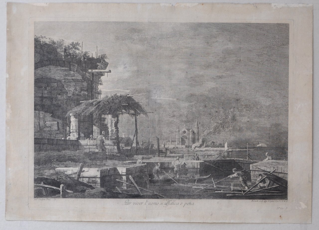 Acquaforte di mm 490 x 352 alla battuta. Carta vergata veneziana. Filigrana non rilevata. Pieni margini. Qualche fioritura. I° stato. Al margine inferiore, in piccolo a sinistra: "Ant.o Canaletto Pinx.". A destra in piccolo: "Berardi Scul.app.o Wagner Ven.a C.P.E.S." In grande al centro "Per viver l'uomo si affatica e pena". Più sotto a destra in piccolo: "N°62 3". Terza tavola della serie dei "Capricci lagunari". Fabio Berardi (1728-1788) nacque a Siena; si trasferì a Venezia verso il 1742 entrando nella bottega di Wagner. Riferisce Succi nel volume "Da Carlevarijs a Tiepolo": "Dopo essere stato inizialmente influenzato nel proprio linguaggio incisorio dai modi vaporosi dell'Amigoni, di cui intagliò alcuni disegni e dipinti. Berardi pubblicò una serie di sei "Villaggi Campestri" e due serie di sei vedute capricciose di Venezia e della Laguna derivate dal Canaletto, nonché una serie di quattro paesaggi rovinistici dallo Zais. Nel 1748 strinse amicizia con Francesco Bartolozzi, assieme al quale divenne uno degli esponenti più rappresentativi della calcografia wagneriana. Incisore di riproduzione per eccellenza, Berardi tradusse, con un tratteggio sciolto e vibrante e con notevolissima sensibilità associata ad un sicuro mestiere, parecchi soggetti di carattere sacro, mitologico, popolaresco e allegorico. Fin dal 1931 Calabi ebbe a lodare nel Berardi in modo particolare "la forma dei chiaroscuri e la profondità dei neri". Petrucci (1966) precisava che "il suo tratteggio non è sempre filato ed inflessibile, come nell'incisione classica" e concludeva "Il Berardi ebbe qualità stilistiche di prim'ordine. In lui si può dire si riassuma raffinandosi sempre più tutta l'estetica incisoria della scuola del Wagner". Accomunato al Wagner nell'impiego del metodo, da lui introdotto a Venezia, di accompagnare l'intaglio ad acquaforte con interventi a bulino, Berardi si differenzia dal maestro per il ricorso ad una tecnica di morsura più complessa e per un segno che scava più profondamente la lastra. Infatti le sue migliori prove si distinguono per i neri solchi vellutati, posti in vivace stacco con le fioriture di bianco sapientemente distribuite nell'intelaiatura della composizione, con un effetto d'insieme di morbida levigatezza non priva di una forza che si potrebbe definire gentile".
