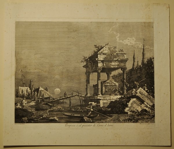 Acquaforte di mm 490 x 352 alla battuta. Carta di cellulosa. Filigrana non rilevata. Pieni margini. Rare fioriture. Terzo stato su tre. Al margine inferiore, in piccolo a sinistra: "Ant.o Canaletto Pinx.". A destra in piccolo: "Berardi Scul.app.o Wagner Ven.a C.P.E.S." In grande al centro "Per viver l'uomo si affatica e pena". Tiratura ottocentesca della quinta tavola della serie dei "Capricci lagunari". Fabio Berardi (1728-1788) nacque a Siena; si trasferì a Venezia verso il 1742 entrando nella bottega di Wagner. Riferisce Succi nel volume "Da Carlevarijs a Tiepolo": "Dopo essere stato inizialmente influenzato nel proprio linguaggio incisorio dai modi vaporosi dell'Amigoni, di cui intagliò alcuni disegni e dipinti. Berardi pubblicò una serie di sei "Villaggi Campestri" e due serie di sei vedute capricciose di Venezia e della Laguna derivate dal Canaletto, nonché una serie di quattro paesaggi rovinistici dallo Zais. Nel 1748 strinse amicizia con Francesco Bartolozzi, assieme al quale divenne uno degli esponenti più rappresentativi della calcografia wagneriana. Incisore di riproduzione per eccellenza, Berardi tradusse, con un tratteggio sciolto e vibrante e con notevolissima sensibilità associata ad un sicuro mestiere, parecchi soggetti di carattere sacro, mitologico, popolaresco e allegorico. Fin dal 1931 Calabi ebbe a lodare nel Berardi in modo particolare "la forma dei chiaroscuri e la profondità dei neri". Petrucci (1966) precisava che "il suo tratteggio non è sempre filato ed inflessibile, come nell'incisione classica" e concludeva "Il Berardi ebbe qualità stilistiche di prim'ordine. In lui si può dire si riassuma raffinandosi sempre più tutta l'estetica incisoria della scuola del Wagner". Accomunato al Wagner nell'impiego del metodo, da lui introdotto a Venezia, di accompagnare l'intaglio ad acquaforte con interventi a bulino, Berardi si differenzia dal maestro per il ricorso ad una tecnica di morsura più complessa e per un segno che scava più profondamente la lastra. Infatti le sue migliori prove si distinguono per i neri solchi vellutati, posti in vivace stacco con le fioriture di bianco sapientemente distribuite nell'intelaiatura della composizione, con un effetto d'insieme di morbida levigatezza non priva di una forza che si potrebbe definire gentile".
